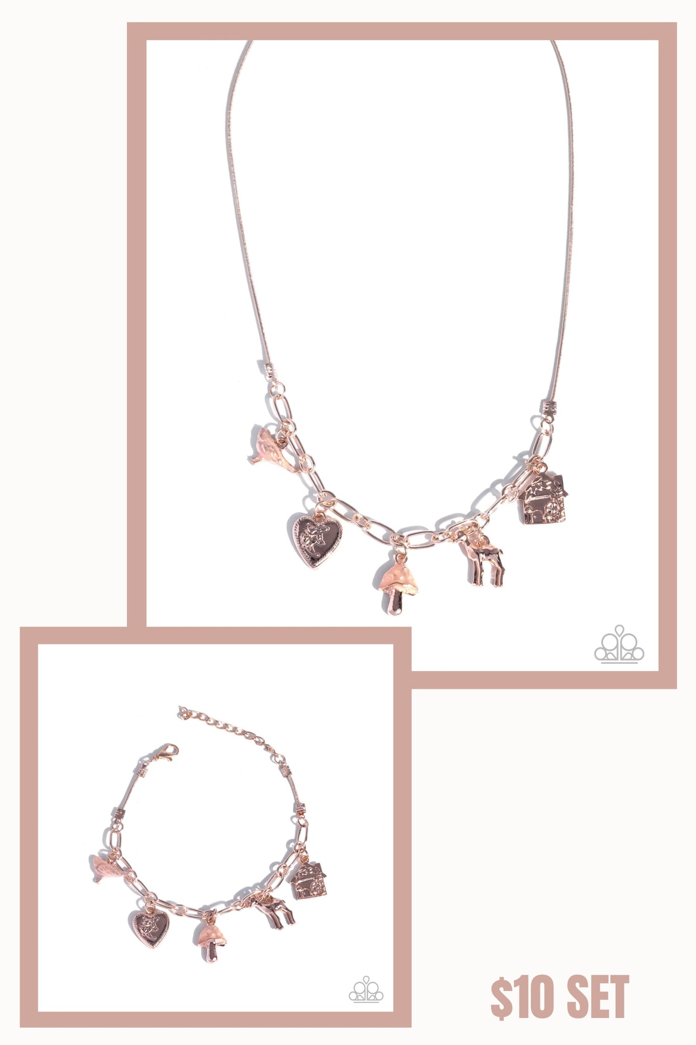NECKLACE: Connecting to a rose gold snake chain, a strand of rose gold paperclip chain coalesces along the center of the neckline. Swaying along the paperclip chain links, a collection of rose gold whimsical charms including a bird, a cottage, a spotted mushroom, a deer, and a heart pendant stamped with a whimsical motif cascades for a fairytale-inspired finish. Features an adjustable clasp closure.