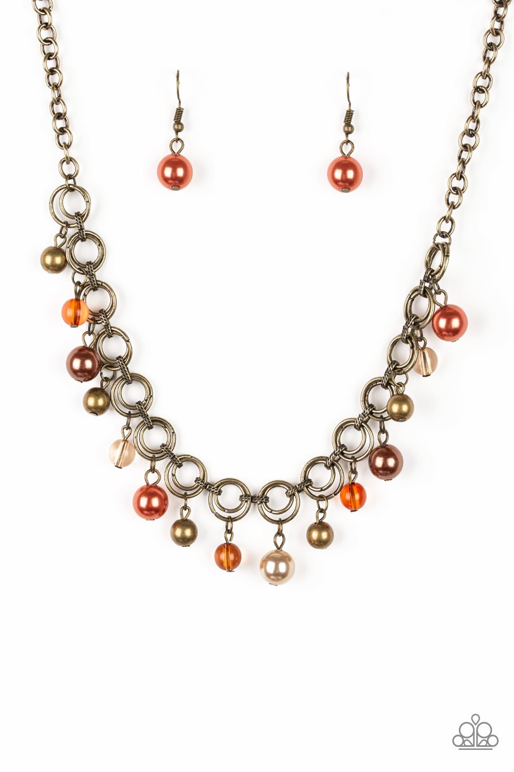 Featuring pearly and glassy finishes, an array of brass, brown, and orange beads swing from a double-linked brass chain, creating a fancy fringe below the collar. Features an adjustable clasp closure.