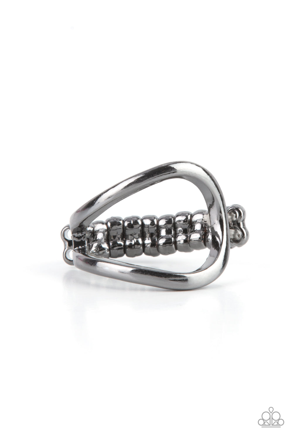 A glistening gunmetal bar asymmetrically curls across the finger, joining into an airy centerpiece for a minimalist inspired look. Features a dainty stretchy band for a flexible fit.