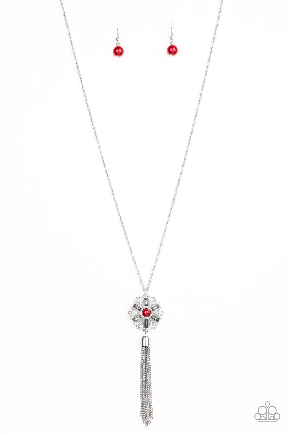 Dotted with a red pearl center, a floral silver pendant radiating with glassy white and smoky rhinestones swings from the bottom of a lengthened silver chain. A shimmery silver tassel swings from the bottom of the glittery pendant for a fabulous finish. Features an adjustable clasp closure.