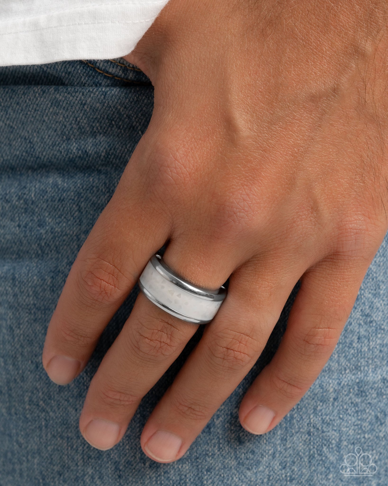 Featuring a white-painted backdrop, flecks of white shell sporadically dot the front of a sleek silver band for a subtle pop of eye-catching color and glitz. Features a stretchy band for a flexible fit.