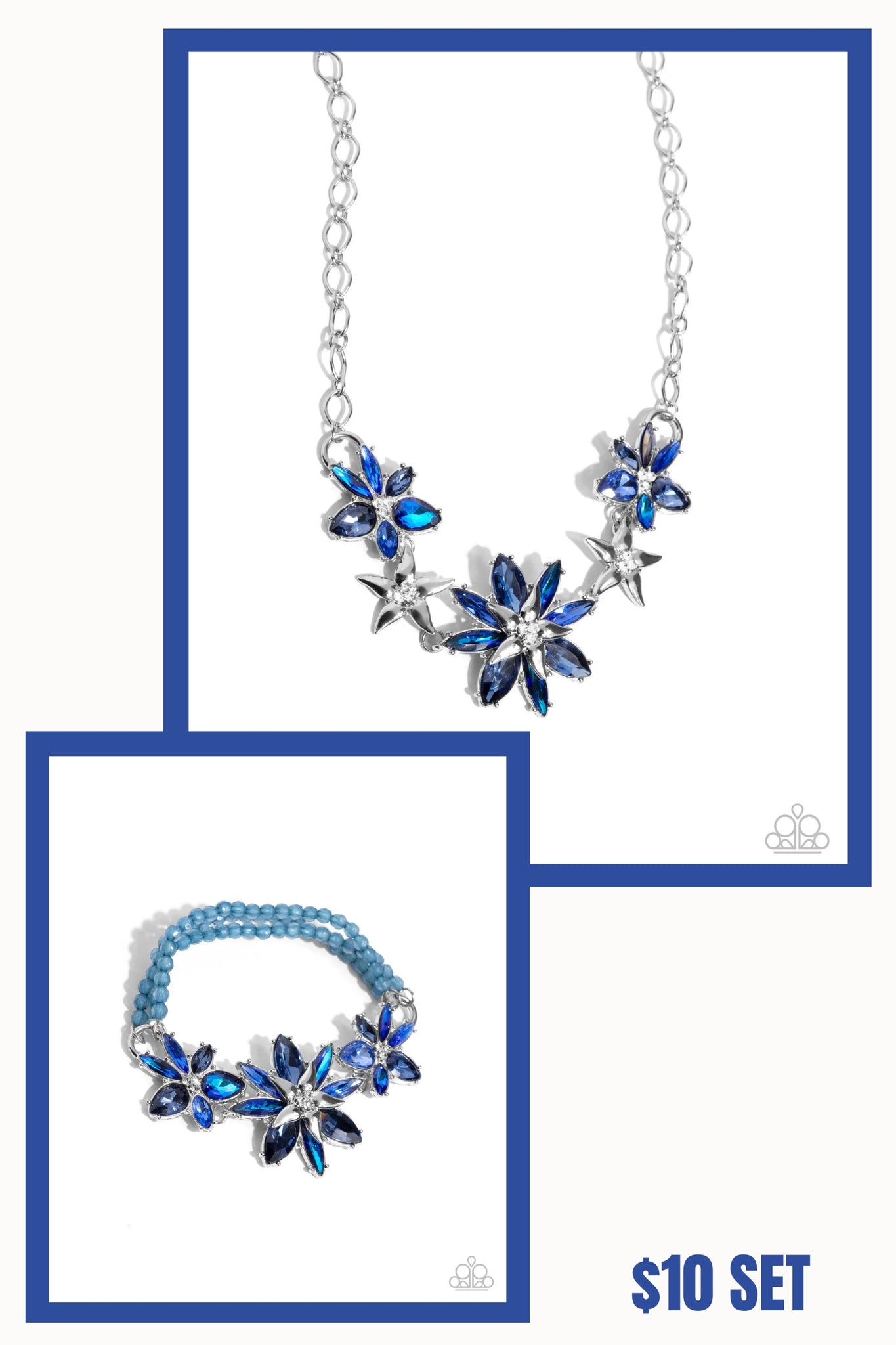 BRACELET: Floral Factor • Blue P9ST-BLXX-060HE: Featuring a three-dimensional effect, a collection of blue multicolored gem flowers made up of marquise-cut and teardrop silver-pronged petals blooms from a trio of white rhinestones in varying sizes, around the wrist. Infused along elastic stretchy bands, three strands of milky navy acrylic beads frame the fantastically floral display, finishing the look off with additional color and flair.