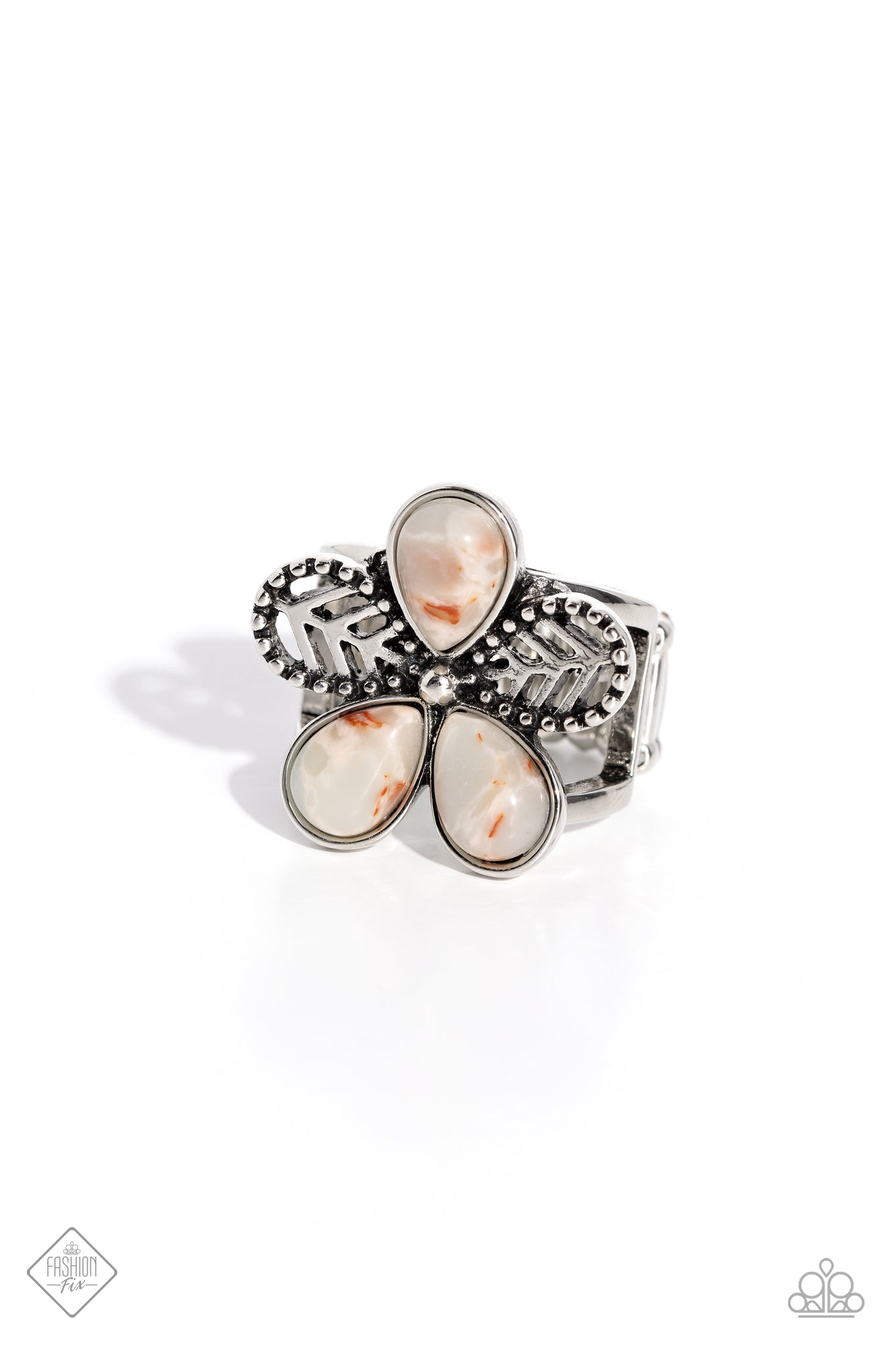Blooming atop airy silver bands, textured silver petals and marbled stone petals combine to create an earthy floral centerpiece atop the finger. Features a stretchy band for a flexible fit. As the stone elements in this piece are natural, some color variation is normal.