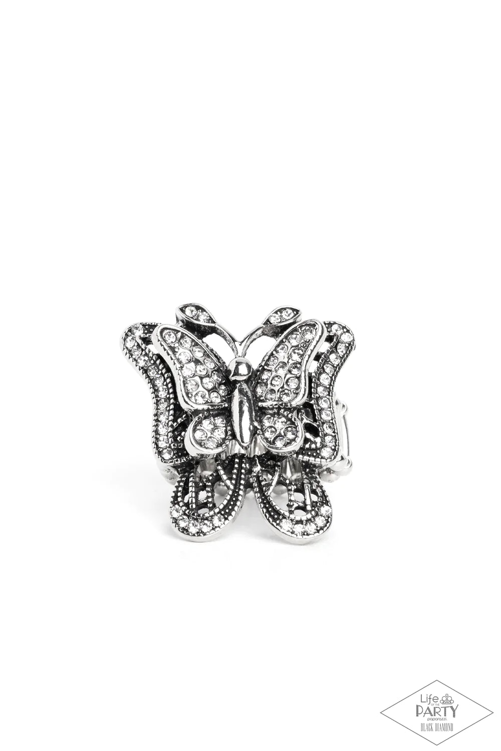 Dazzling white rhinestones are sprinkled across the wings of a silver butterfly, creating a whimsical frame atop the finger. Features a stretchy band for a flexible fit.
