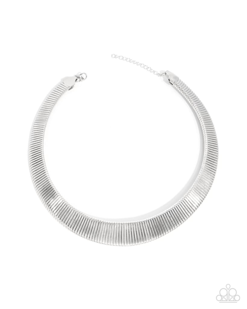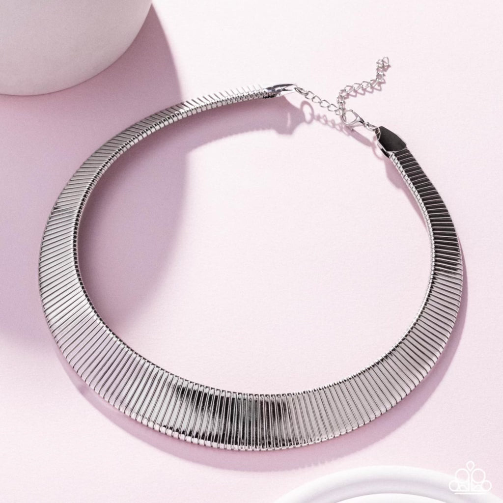 A sleek silver frame showcases a series of flat, polished metal bars seamlessly linked together, creating a high-shine, streamlined finish that rests elegantly along the neckline. Features an adjustable clasp closure.