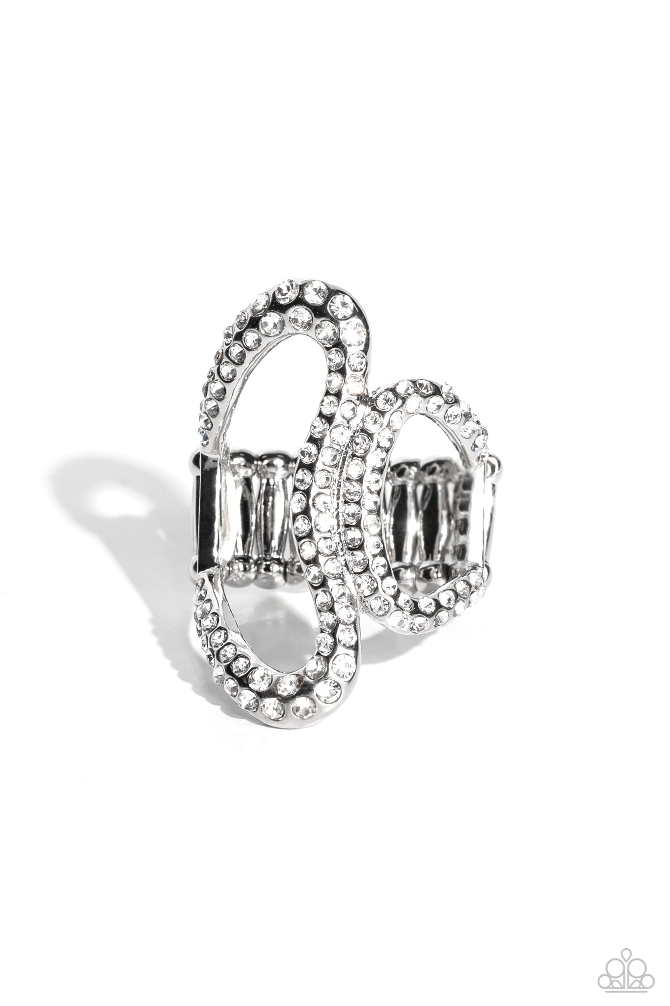 Glistening silver bars asymmetrically curl across the finger, joining into an airy centerpiece for a minimalist-inspired look. Encrusted along the curves of each silver bar, two rows of dainty white rhinestones shimmer and shine for a refined finish. Features a stretchy band for a flexible fit.
