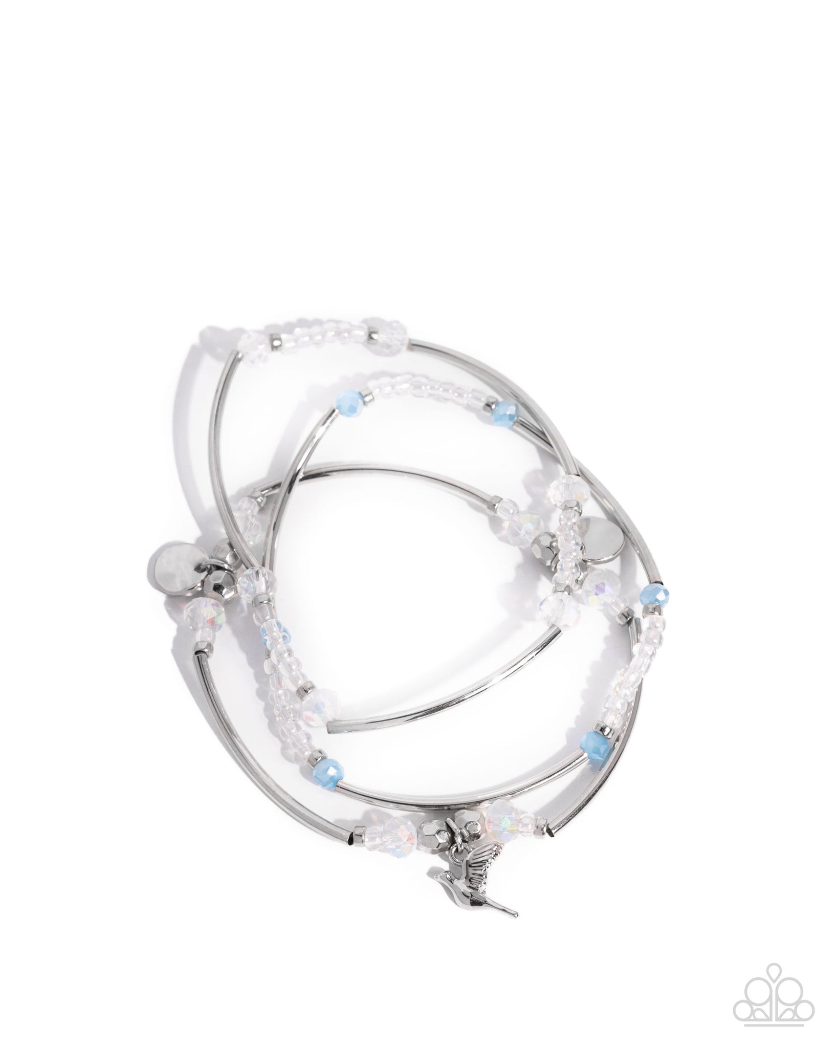 Infused along elastic stretchy bands, a collection of curved silver bars, silver studs, iridescent seed beads, textured silver beads, faceted blue and iridescent beads, hammered silver discs, and a silver dove stack along the wrist for a peacemaking prismatic display. Due to its prismatic palette, color may vary.