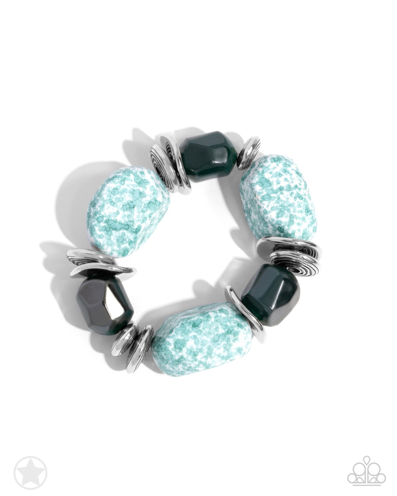 Chunky blue beads combine with intricate silver details on a stretchy band.