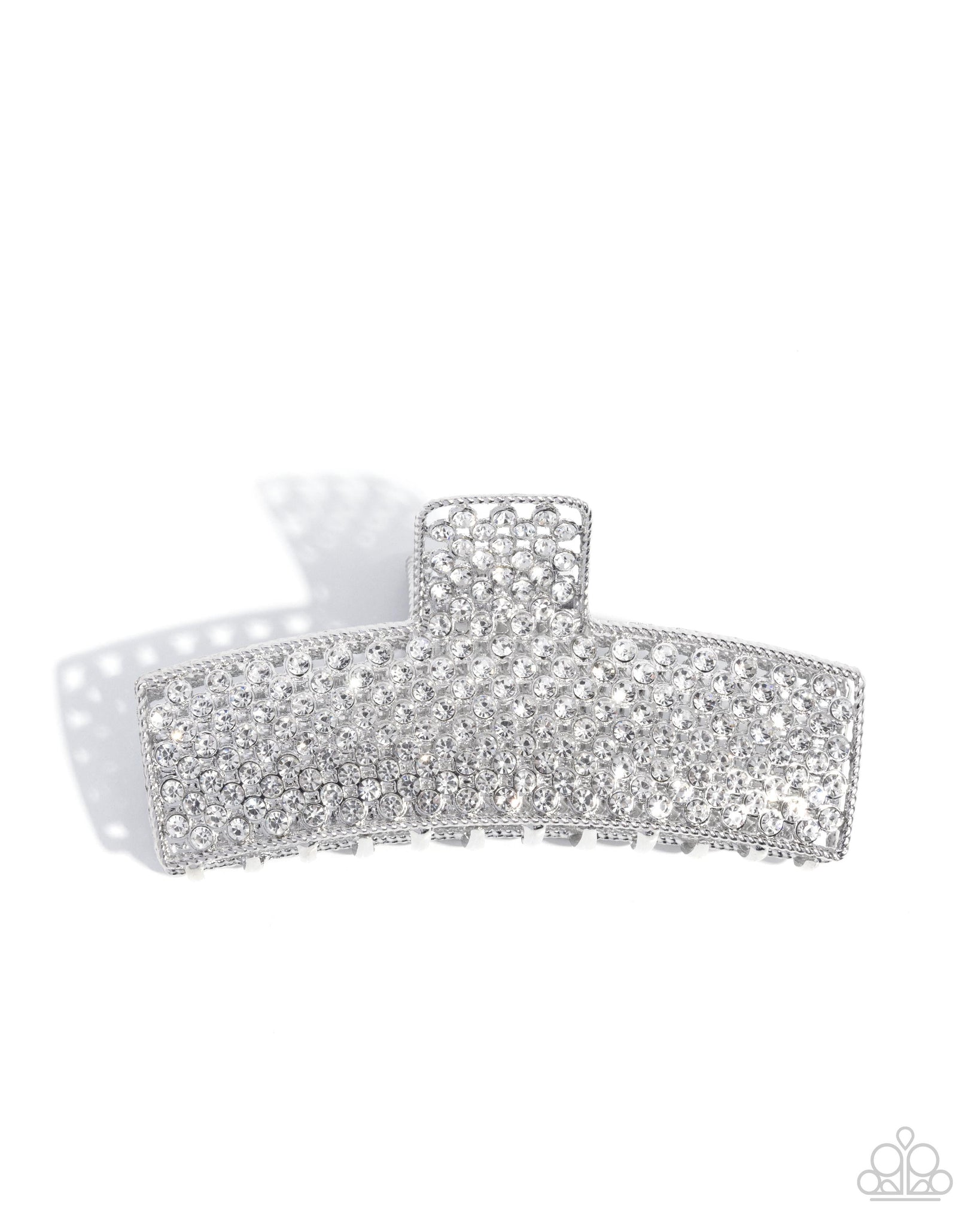 HAIR CLIP: Featuring an explosion of white rhinestones, an airy silver twist-textured clip holds the hair away from the face for an on-the-go chic display. Clip measures approximately 4" in length and 2" in width.