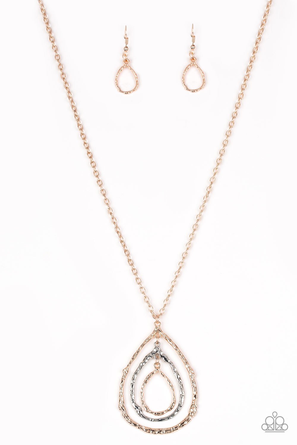 Brushed in a high-sheen shimmer, delicately hammered rose gold and silver teardrop silhouettes swing from the bottom of a lengthened rose gold chain for a rustic look. Features an adjustable clasp closure.