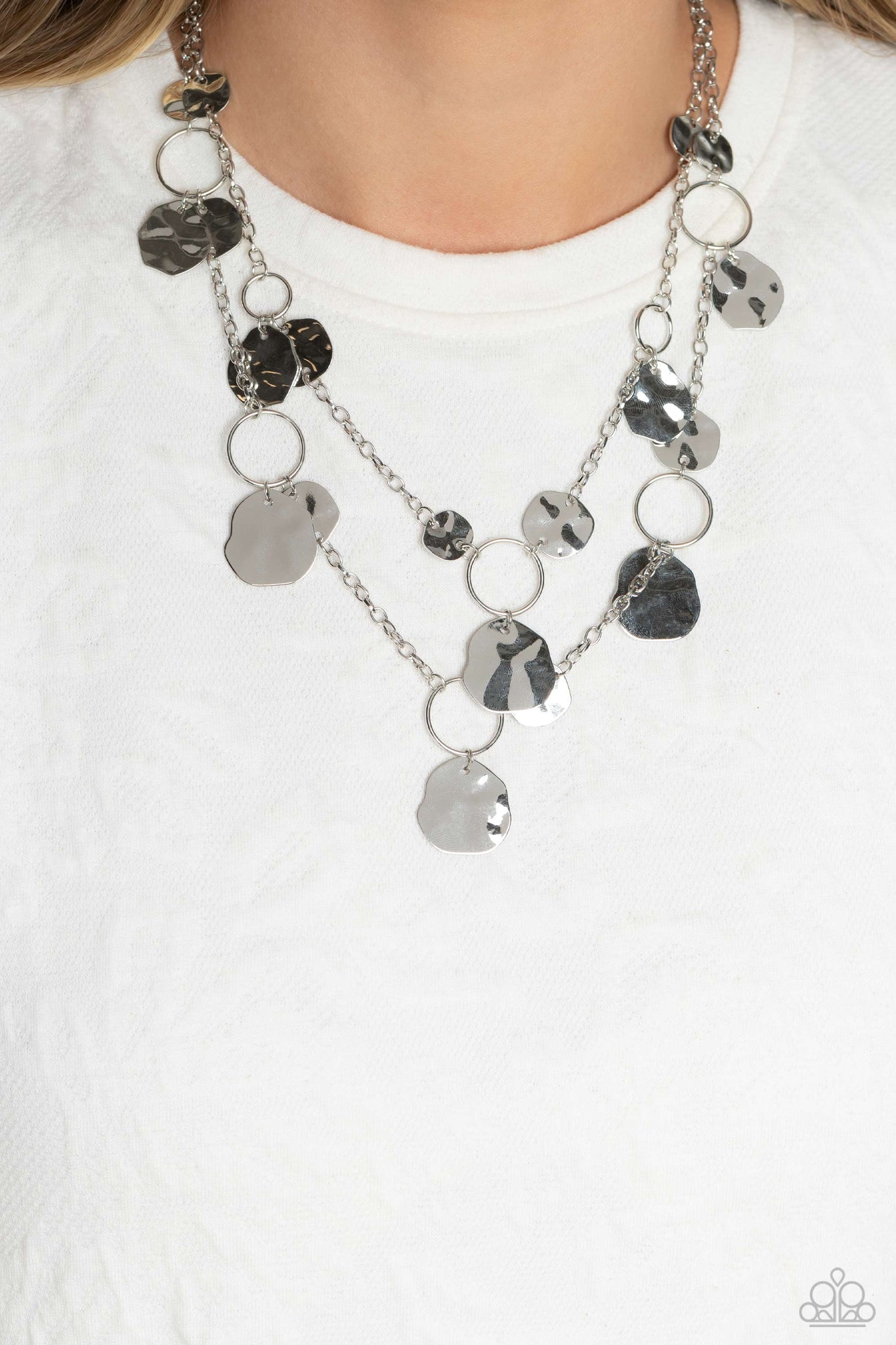 Infused along two silver chains, smooth silver hoops and abstract, hammered silver discs fall down the neckline for an edgy, boisterous display. Features an adjustable clasp closure.