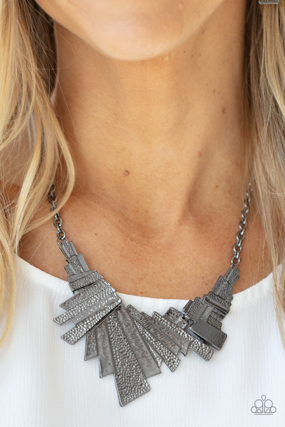 Varying in hammered detail, a collision of rectangular gunmetal frames connect into three shockingly shimmery plates below the collar for an intense industrial inspired look. Features an adjustable clasp closure.