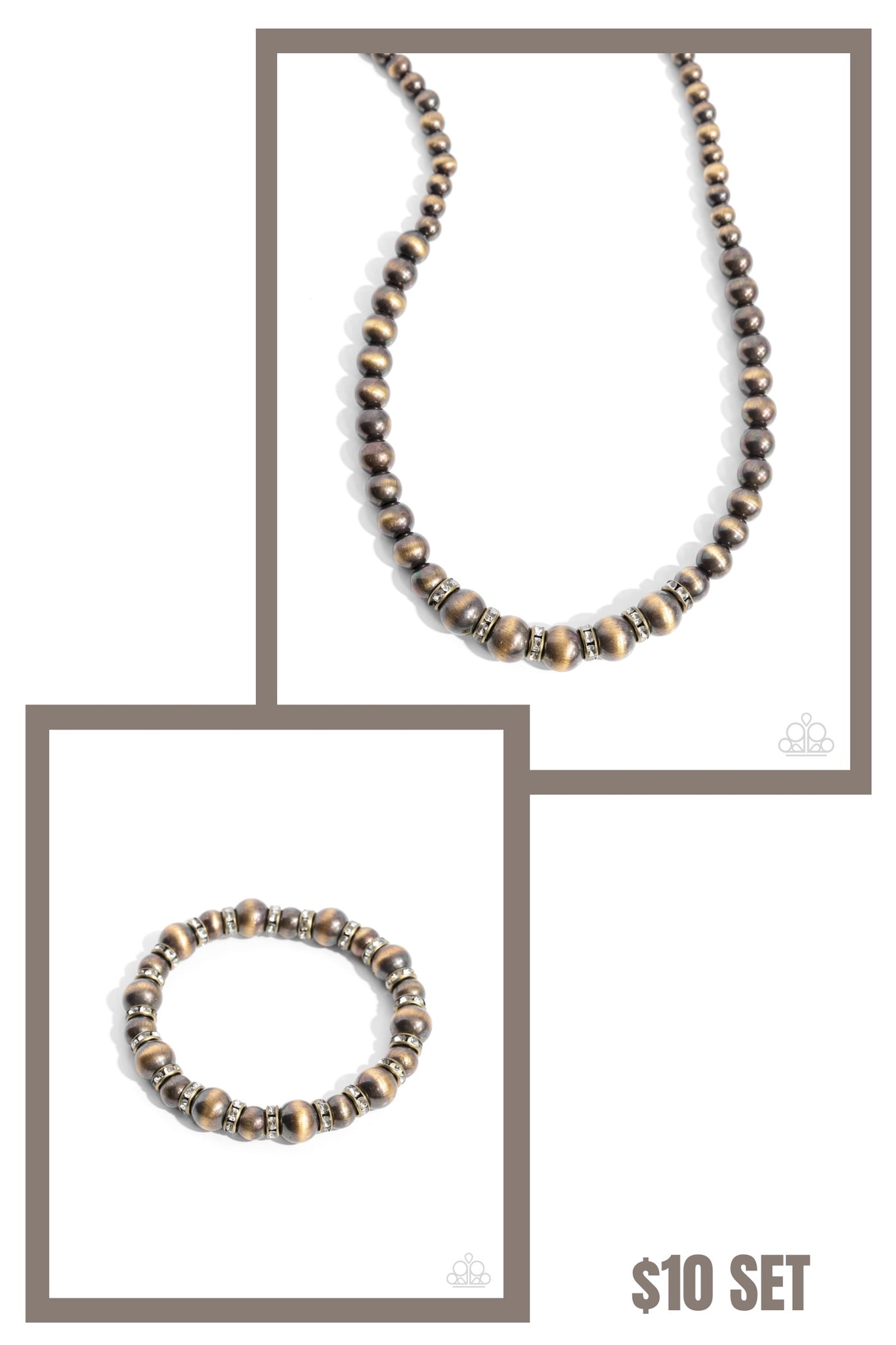 NECKLACE: Infused along an invisible string, a collection of brass-brushed Navajo Pearls of varying sizes reflect light in every direction below the neckline for a radiantly rustic display. White rhinestones adorn brass fittings, sporadically interrupting the center of the design for additional shimmer. Features an adjustable clasp closure.