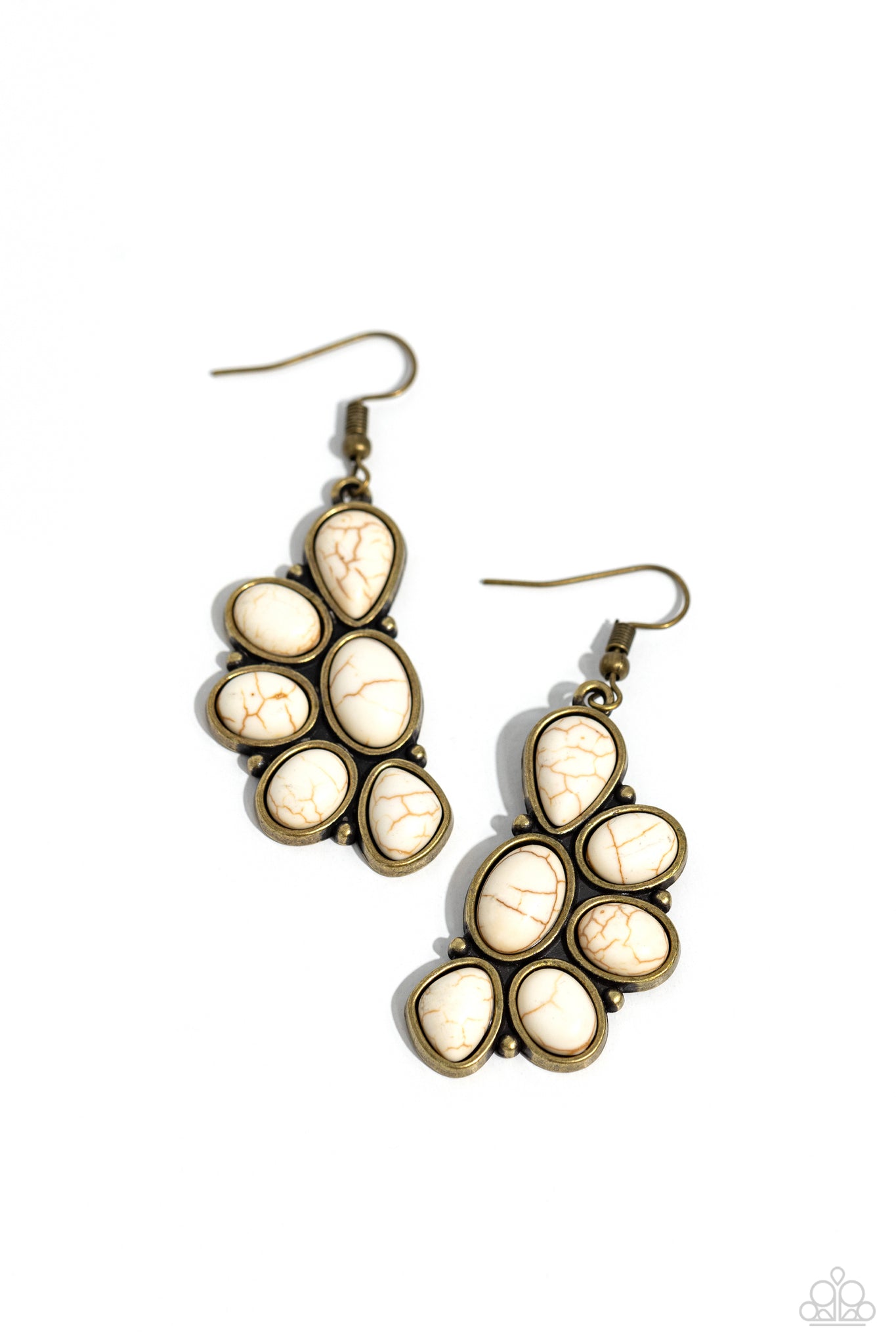Featuring pronged brass fittings, an earthy collection of round, teardrop, and triangular cut white stones delicately coalesces into a half moon frame for an artisan inspired flair. Earring attaches to a standard fishhook fitting.