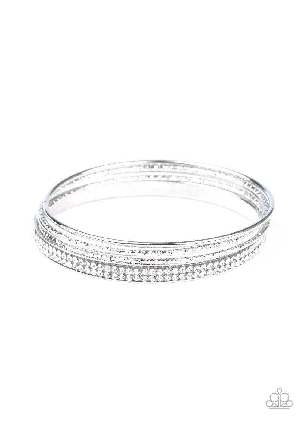 Pairs of smooth and hammered silver bangles join a white rhinestone encrusted bracelet around the wrist, creating an edgy stack of sparkle.