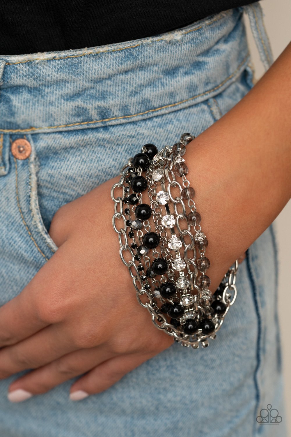 Strung between two silver bars, a glittery compilation of mismatched silver chains, metallic flecked crystals, smoky and black beads, and glittery white and black rhinestone dotted chains layer around the wrist for a statement-making look. Features an adjustable clasp closure.