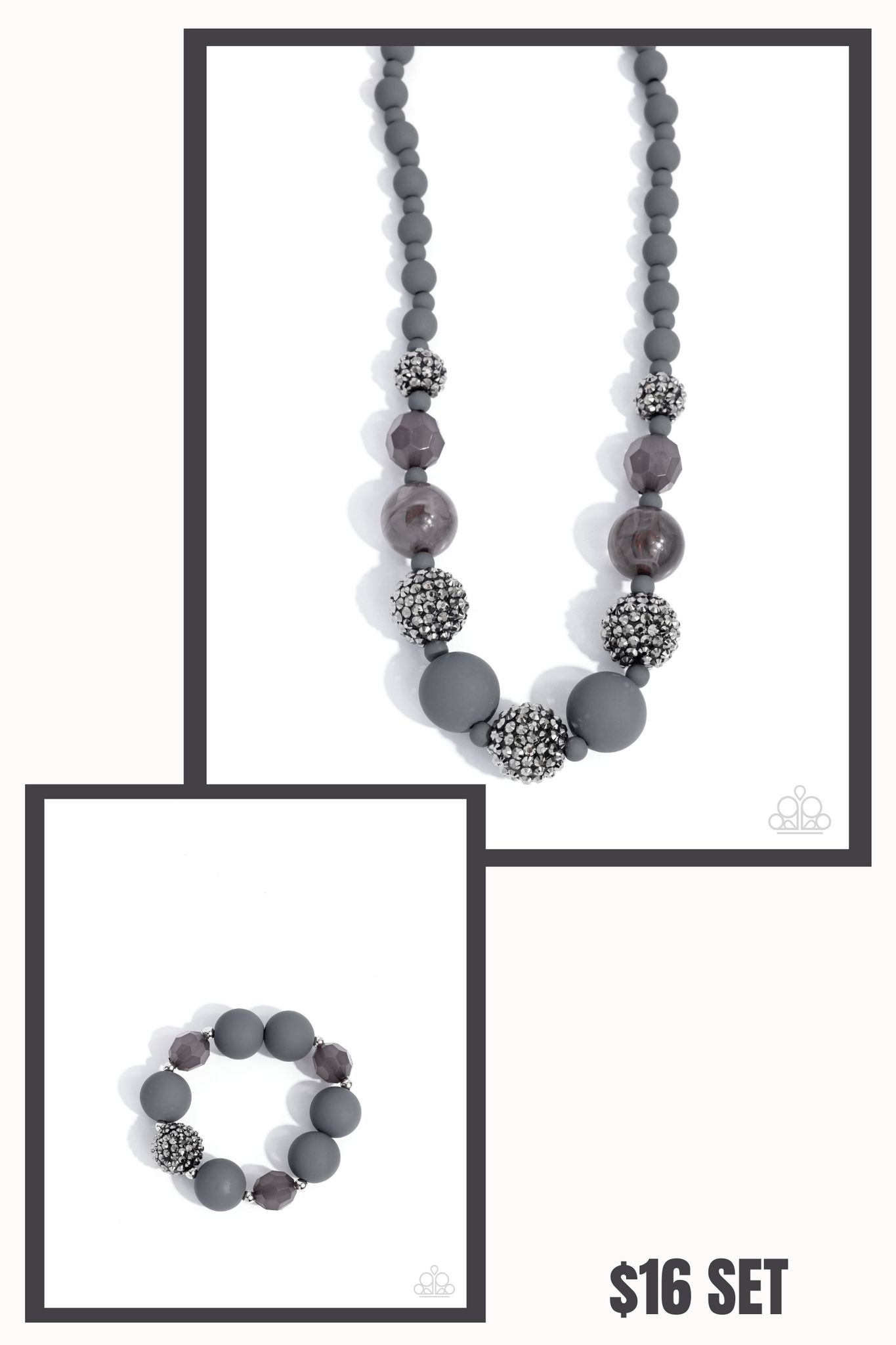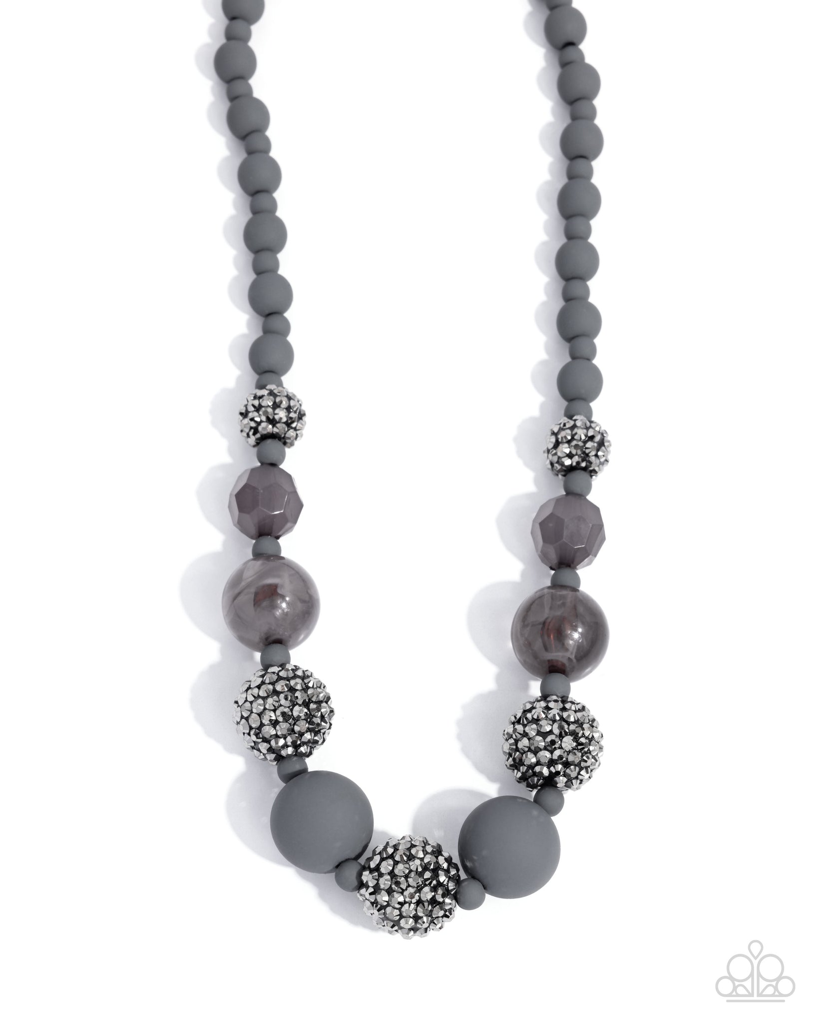 NECKLACE: Hematite Haute • Silver P2ST-SVXX-250IEA: blend of matte gray beads, faceted smoky accents, and oversized marbled gray beads is interspersed with dazzling hematite-encrusted spheres along the neckline. Features an adjustable clasp closure.