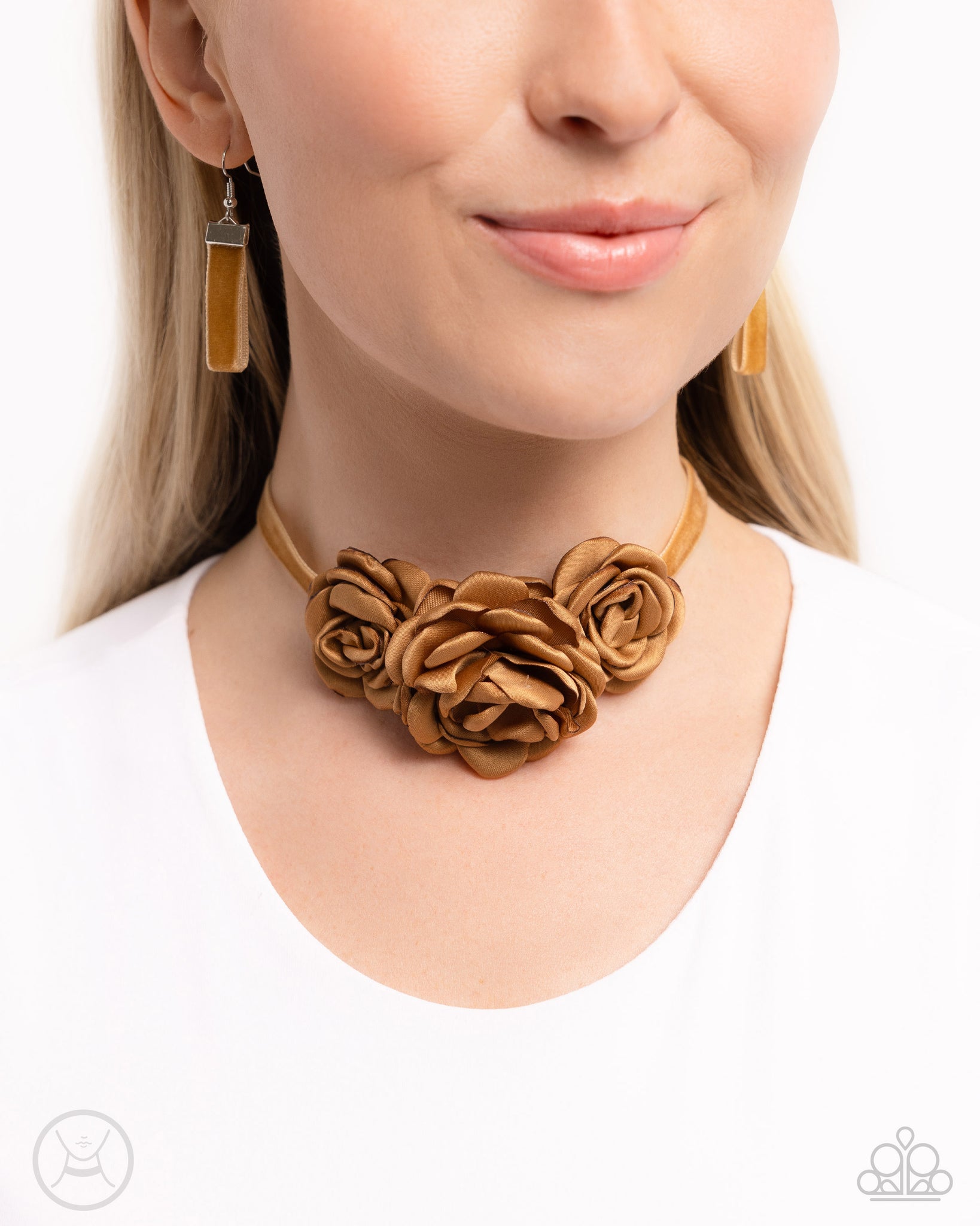 Light brown satin petals form into a decadent trio of rosettes atop a sleek satin ribbon in the same hue along the collar for a whimsical display. Features an adjustable clasp closure.