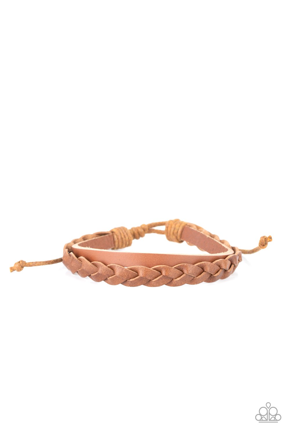 Strands of brown leather cording braid across the front of a dainty leather band, creating a rustic display around the wrist. Features an adjustable sliding knot closure.