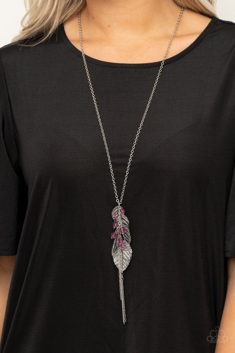 A whimsical tassel of silver leaf frames, purple crystal-like beads, and shimmery silver chains cluster at the bottom of a lengthened silver chain for a colorfully seasonal look. Features an adjustable clasp closure.