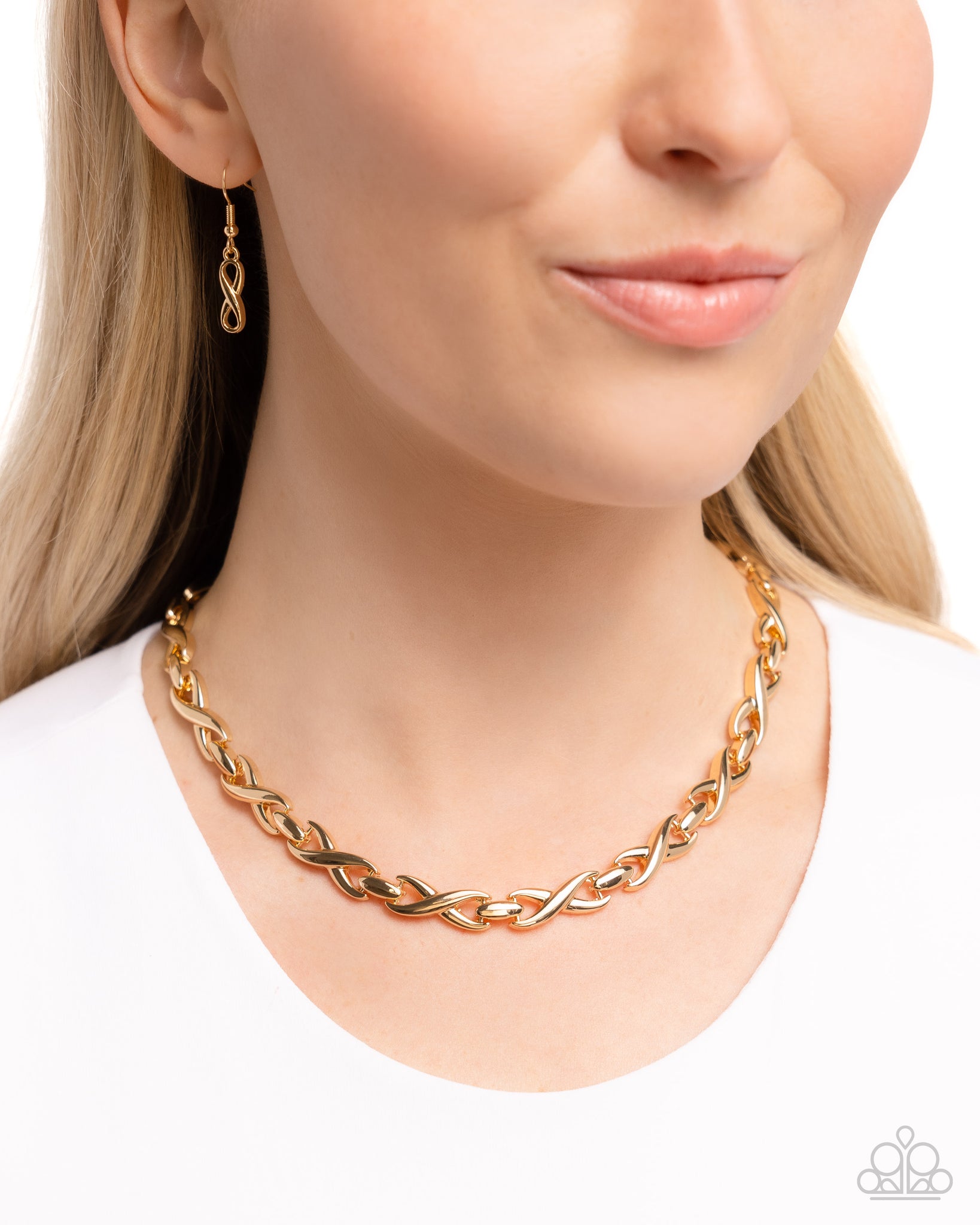 Featuring a high-sheen, gold links twist and curve into inifinity-like frames that delicately connect around the collar for an iconic look. Features an adjustable clasp closure.