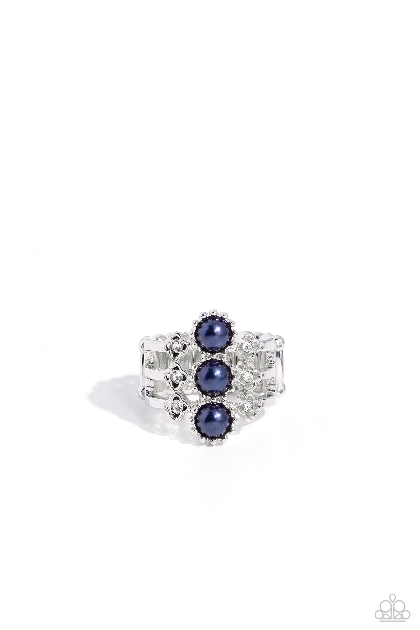 Infused with glossy Montana pearls, a studded silver frame is pressed into the center of a layered silver band for a seasonal look. Flanking the central pearls, trios of silver flowers with white rhinestone centers are pressed into the layered silver band for additional glitz atop the finger. Features a stretchy band for a flexible fit.