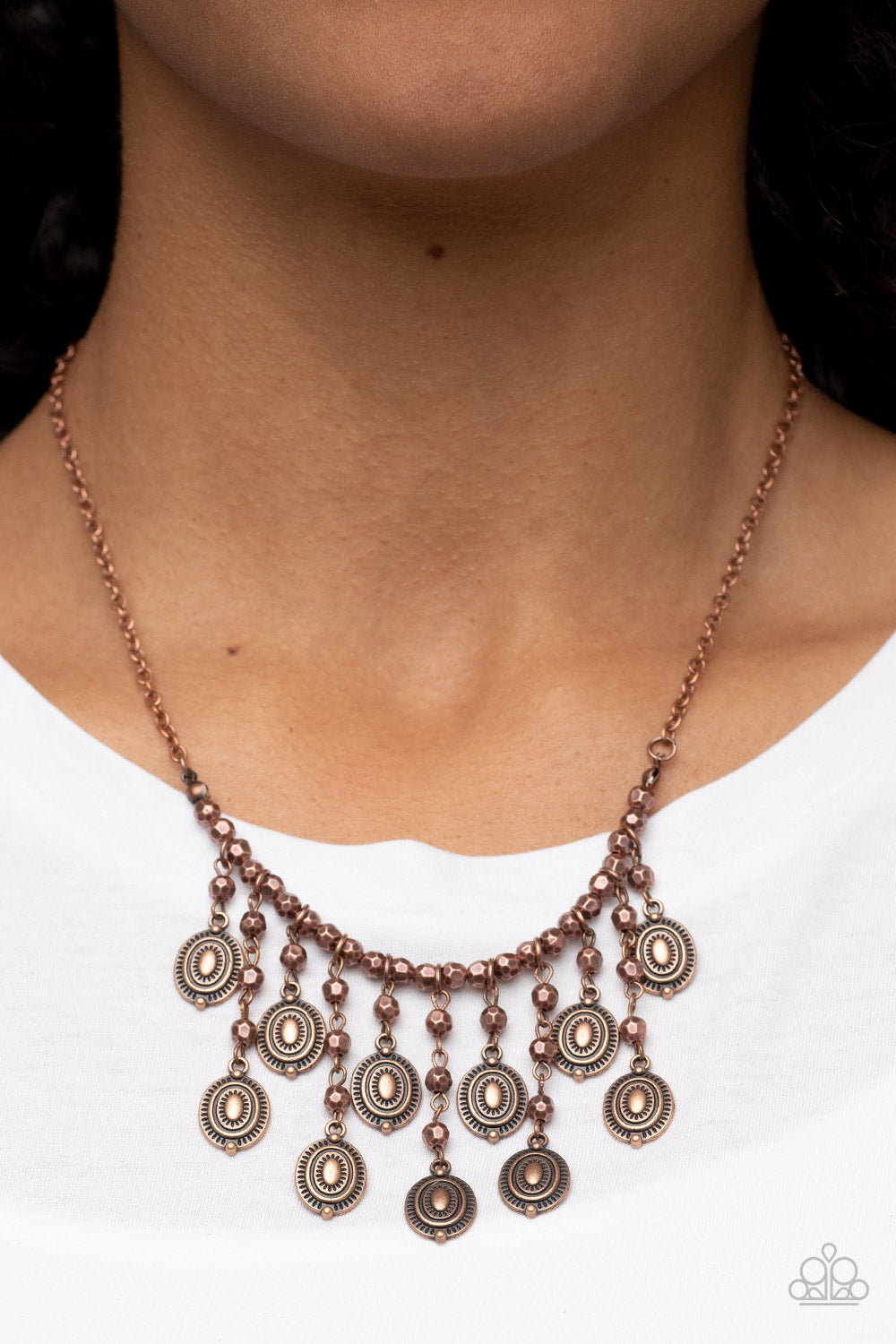 Attached to an antiqued copper chain, a strand of faceted copper beads are threaded along an invisible wire below the collar. The gritty beads give way to a copper beaded tassel featuring textured copper frames, resulting in a rustic fringe below the collar. Features an adjustable clasp closure.