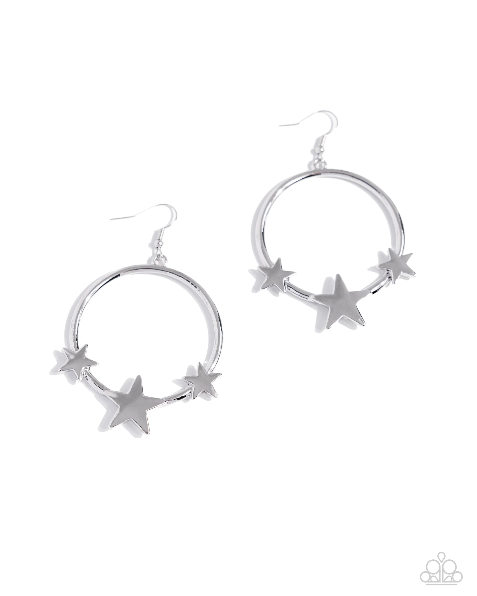 Featured at the bottom of a sleek silver hoop, three stars in various sizes create a simple star-spangled statement. Earring attaches to a standard fishhook fitting.