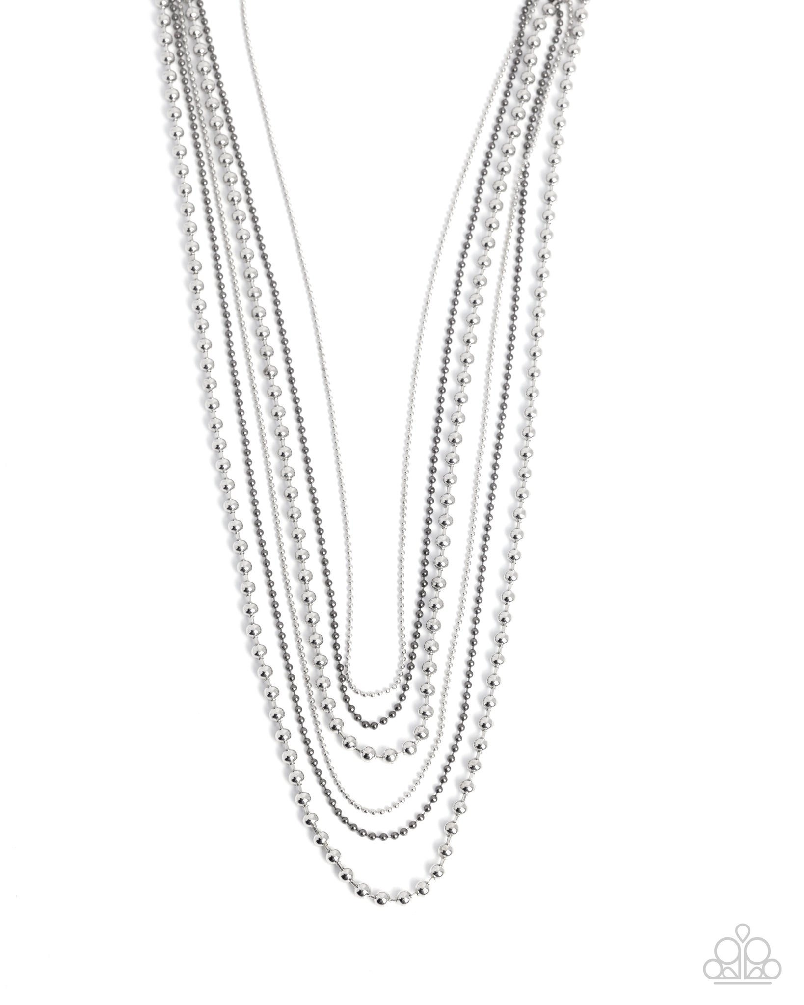 A cascade of shiny silver and gunmetal ball chains featuring varying sizes layers along the neckline for a chic and minimalist finish. Features an adjustable clasp closure.
