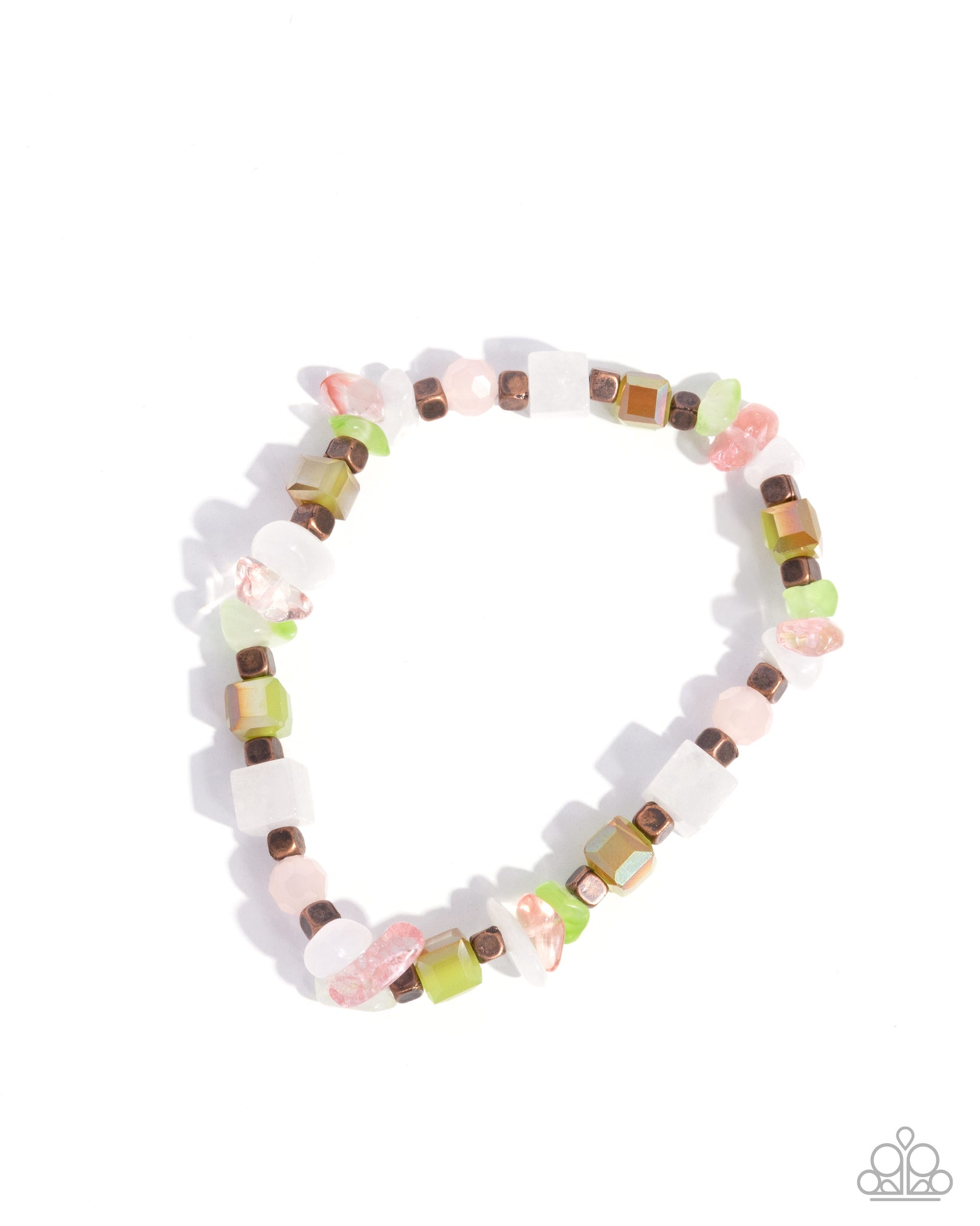 Infused along an elastic stretchy band, a collection of copper cubes, white stones, rose stones, and jade stones in varying sizes, and green UV shimmery square beads alternate in a feminine freestyle pattern along the wrist. As the stone elements in this piece are natural, some color variation is normal.