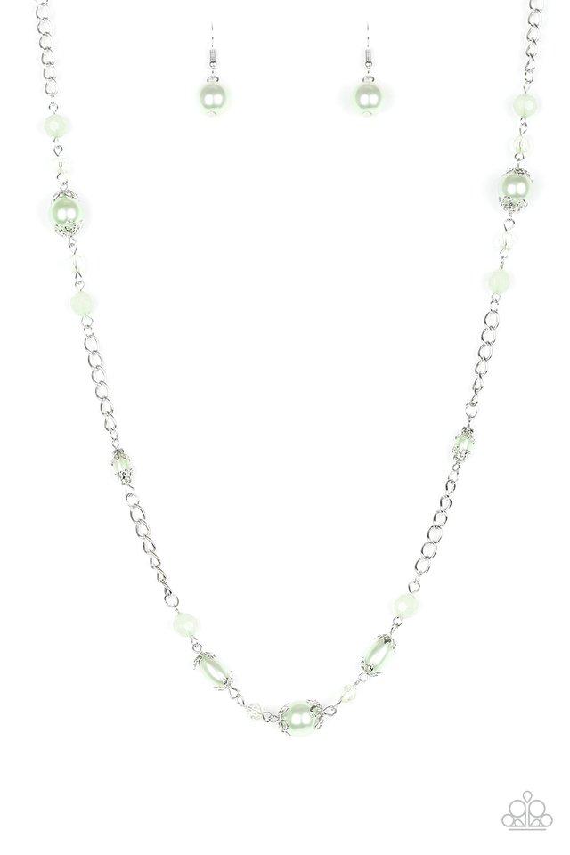 Pearly green, faceted and opaque crystal-like beads trickle along an elegantly elongated silver chain for a refined look. Features an adjustable clasp closure.