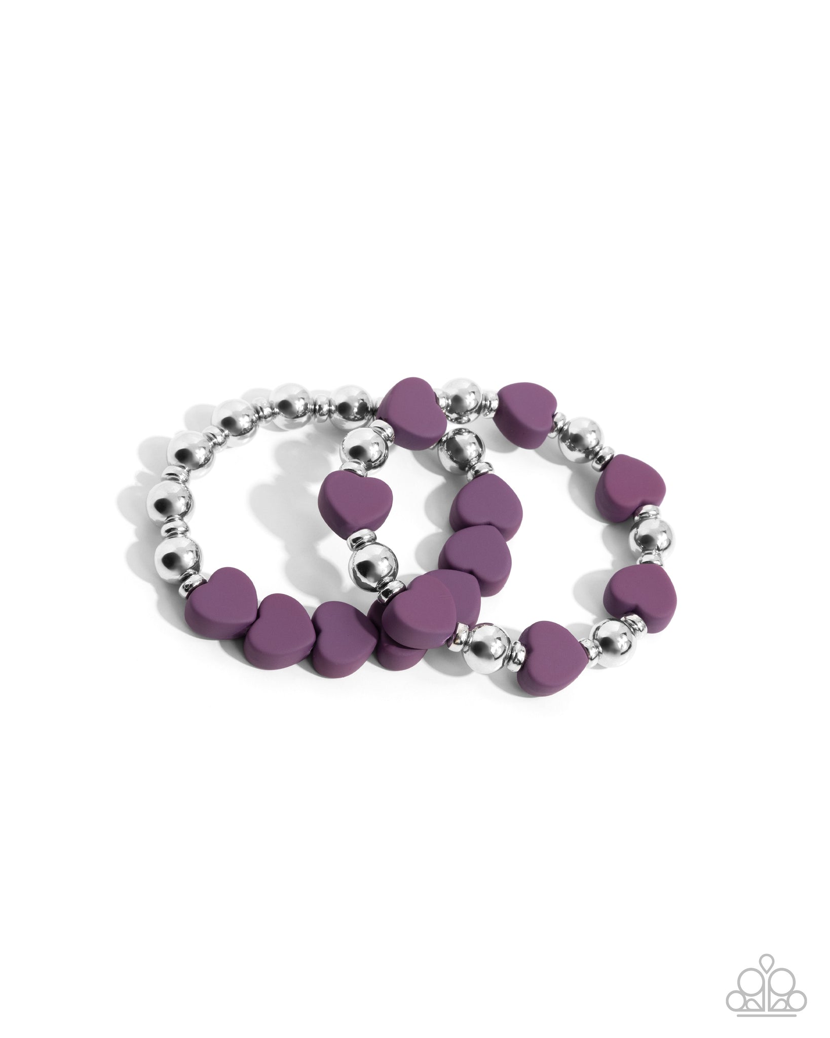 BRACELET: Malibu Moxie • Purple P9WH-PRXX-299FN: Infused along elastic stretchy bands, a collection of silver discs, Plum heart beads, and round silver beads pattern and stack atop the wrist for a heartfelt haute look.