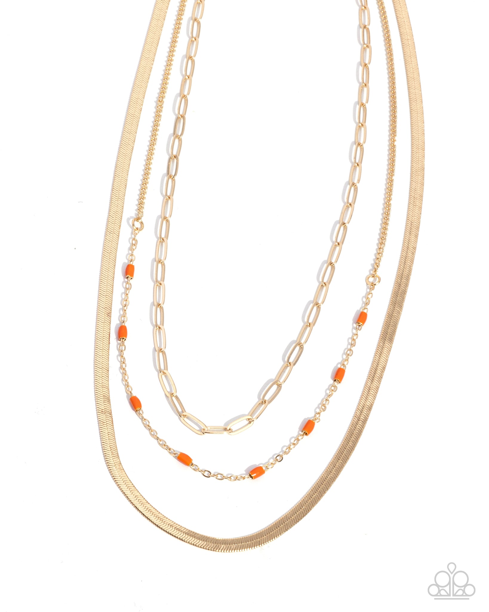 Infused with Red Orange cylindrical beads, a dainty gold chain joins a gold herringbone and gold paperclip chain, coalescing below the neckline in layers of color and class. Features an adjustable clasp closure.
