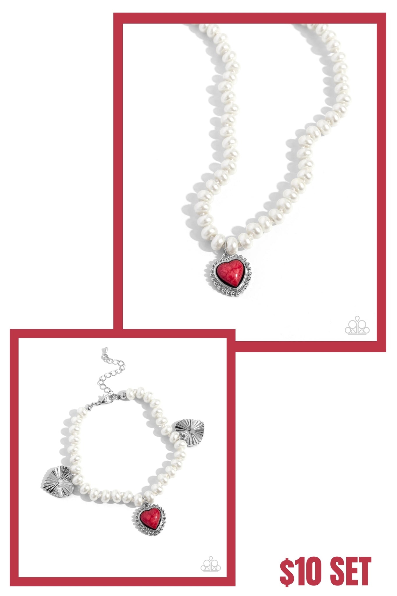 NECKLACE: Infused along an invisible string, flattened glossy white pearls loop around the neckline for a refined look. Pressed in a silver-studded heart frame, a red marbled stone adds a pop of classy color. Features an adjustable clasp closure. As the stone elements in this piece are natural, some color variation is normal.