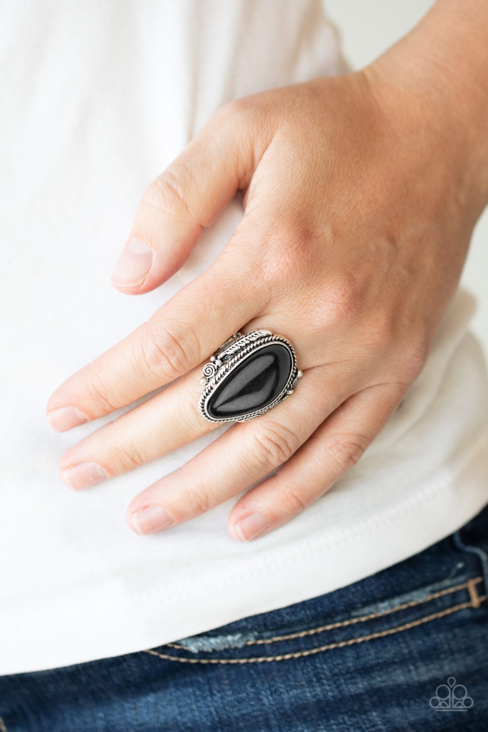 An asymmetrical black stone is nestled inside of an ornate silver frame flanked by silver swirling frames and dainty silver feather charms for a whimsical look. Features a stretchy band for a flexible fit.