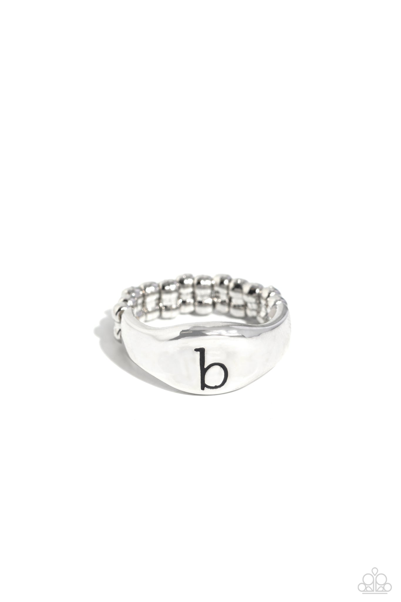 Pressed into the center of a beveled silver band, the black letter "b" stands out for a simple, sentimental centerpiece. Features a stretchy band for a flexible fit.
