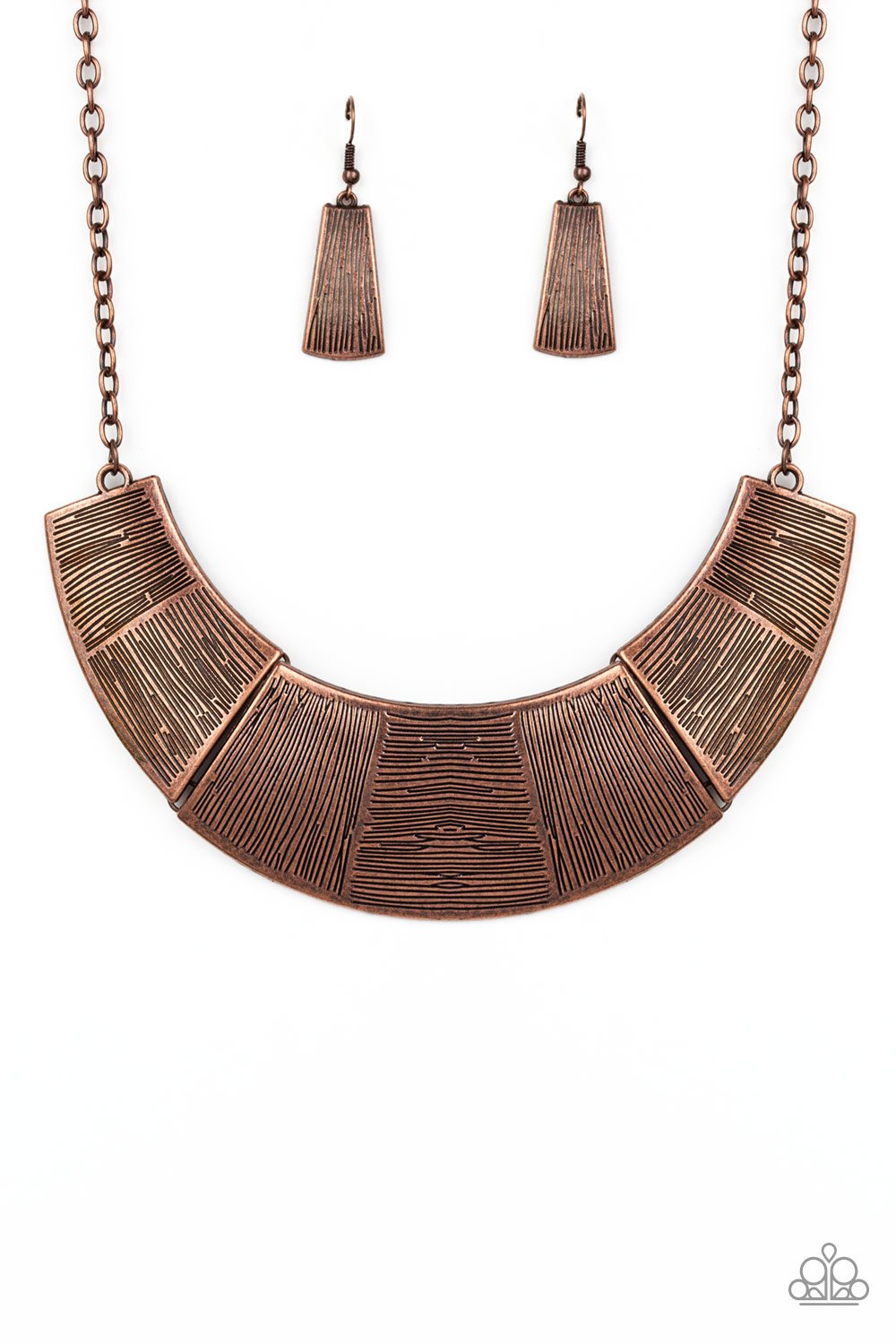 Etched in sections of vertical and horizontal linear textures, glistening antiqued copper plates link together, forming a bold half-moon pendant below the collar. Features an adjustable clasp closure.