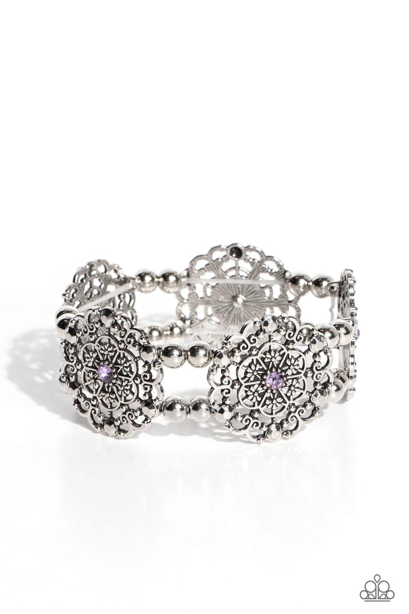 Dainty silver studs and floral details scatter across the fronts of airy medallions fashioned from whimsical floral-shaped filigree. Centered in each intricate design, purple rhinestones glimmer for a sparkly flourish. The splendid frames alternate along stretchy bands and silver beads resulting in a regally refined design that wraps around the wrist.