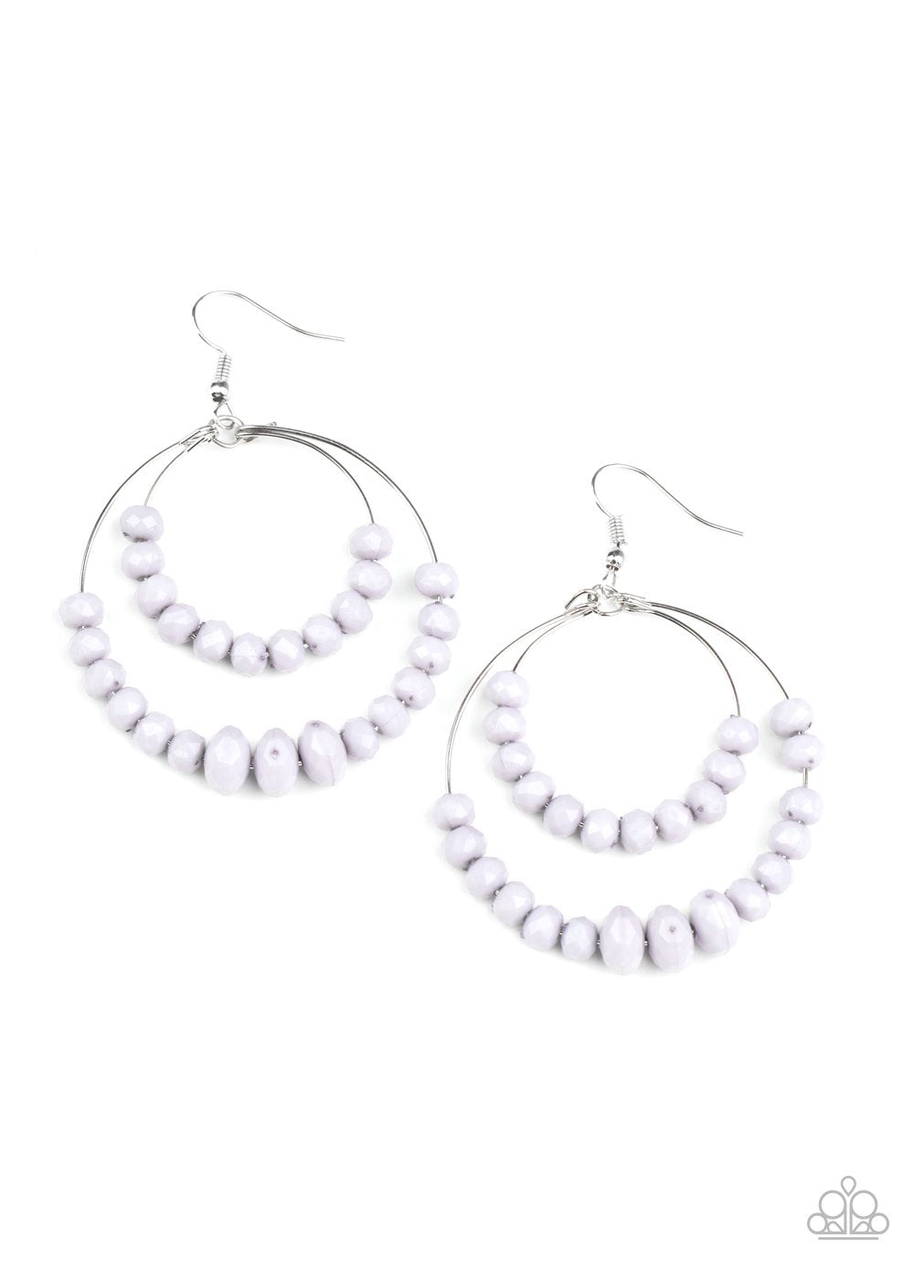 Faceted Sleet beads slide along the bottom of two dangling wire hoops, creating a flirtatiously stacked lure. Earring attaches to a standard fishhook fitting.