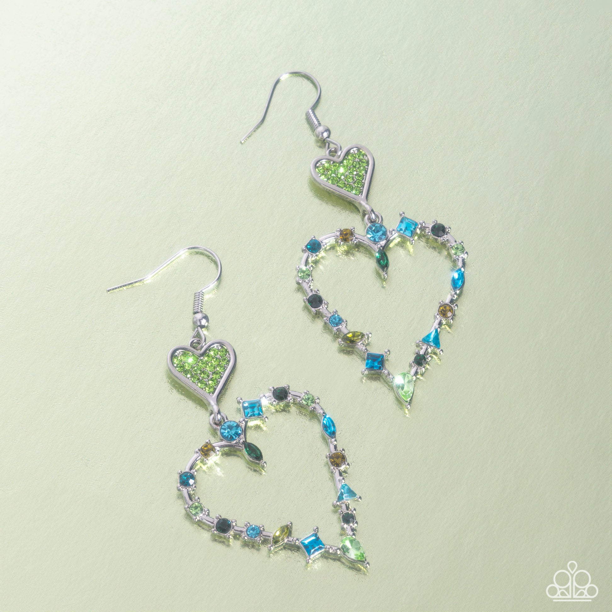 Embellished in green rhinestones, a dainty silver heart gives way to a silver heart silhouette frame. Set in pronged silver fittings along the heart frame, green and blue multicolored gems and rhinestones in various shapes glitter for a bewitching display. Earring attaches to a standard fishhook fitting.