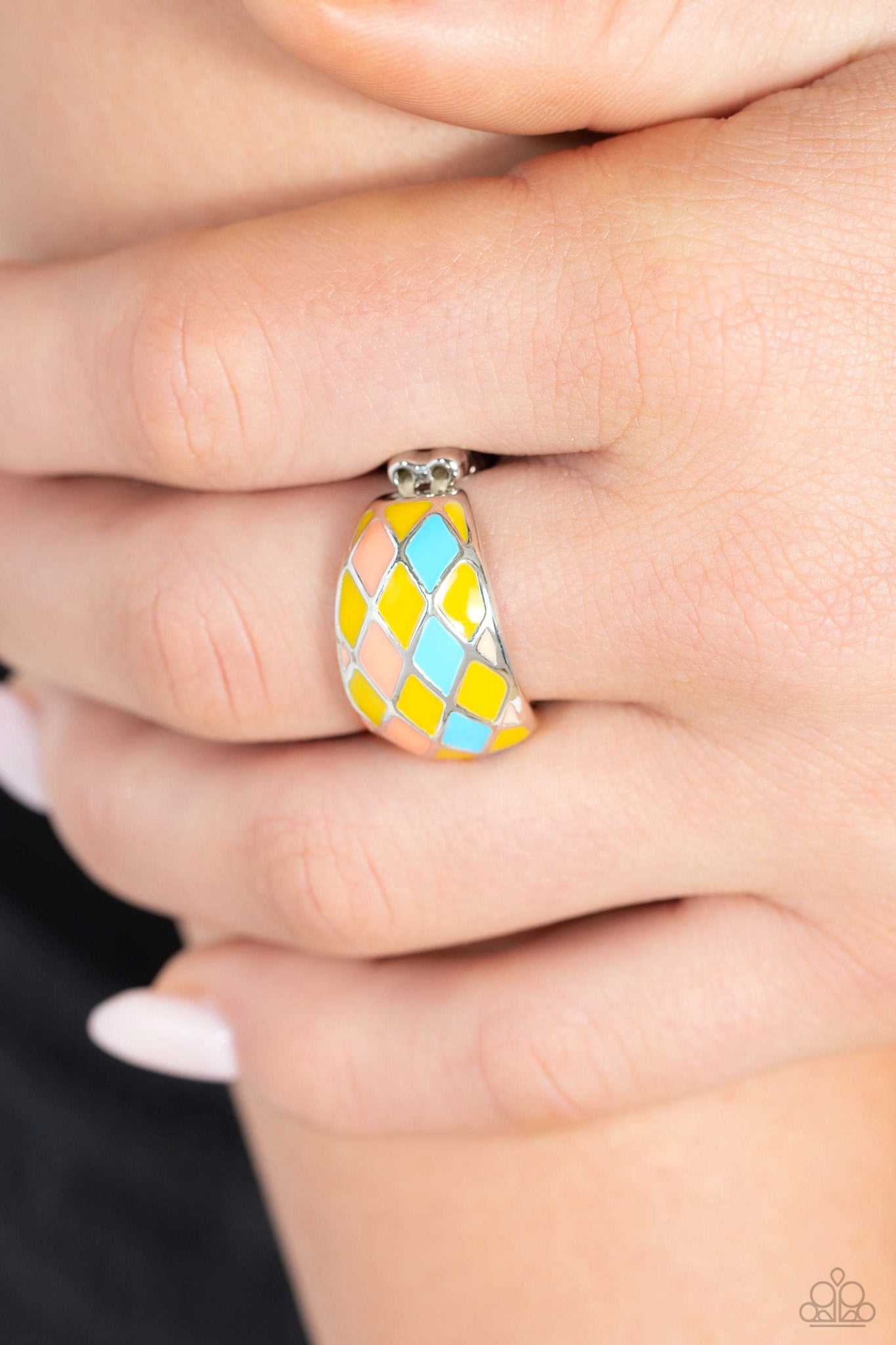 Painted diamonds in shades of yellow, coral, and light blue stack across the finger on a band of silver for a whimsical optical illusion. Features a dainty stretchy band for a flexible fit.