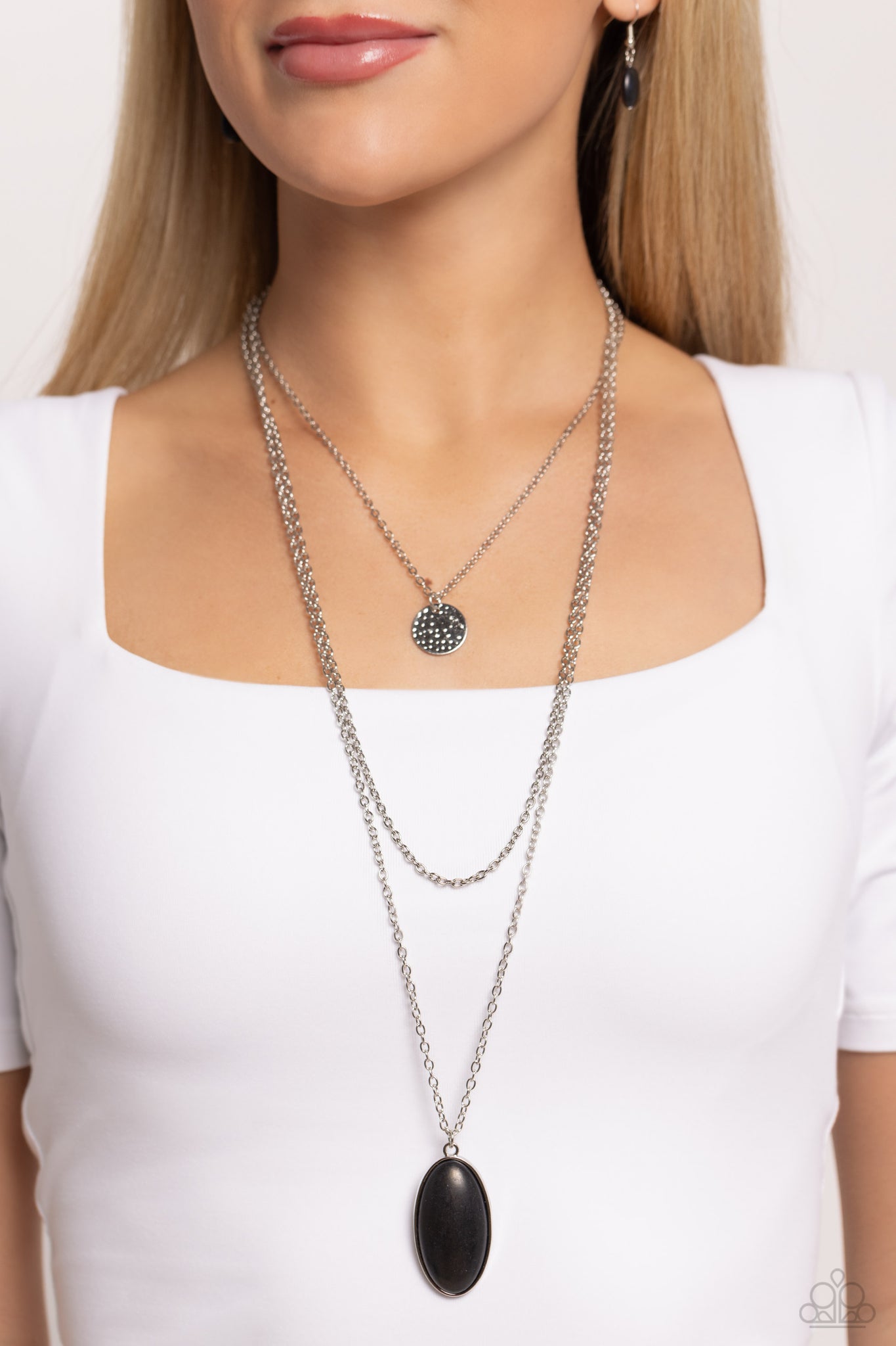 An elongated oval black stone, pressed into a silver frame, swings from the bottom of an elongated silver chain. Layers of silver chain and a hammered silver disc add charisma as they combine to fall below the collar for a timeless earthy finish. Features an adjustable clasp closure. As the stone elements in this piece are natural, some color variation is normal.