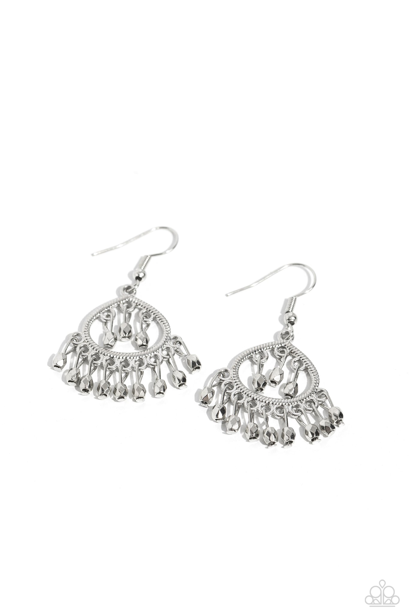 A wide silver teardrop frame encompasses a flirty fringe of faceted silver beads for a perfectly palatial look. Earring attaches to a standard fishhook fitting.