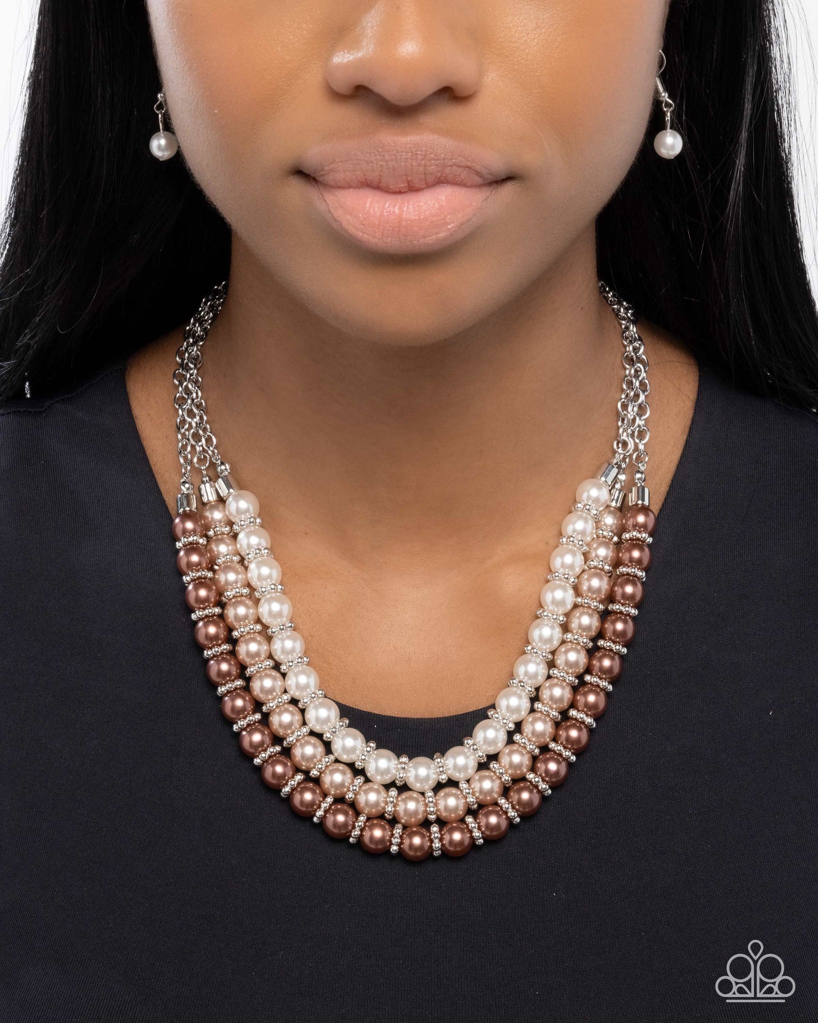 Infused along a trio of silver cable chains, a collection of Brush, brown, and white pearls alternate with silver wheel beads for an opulent ombré display. Features an adjustable clasp closure.