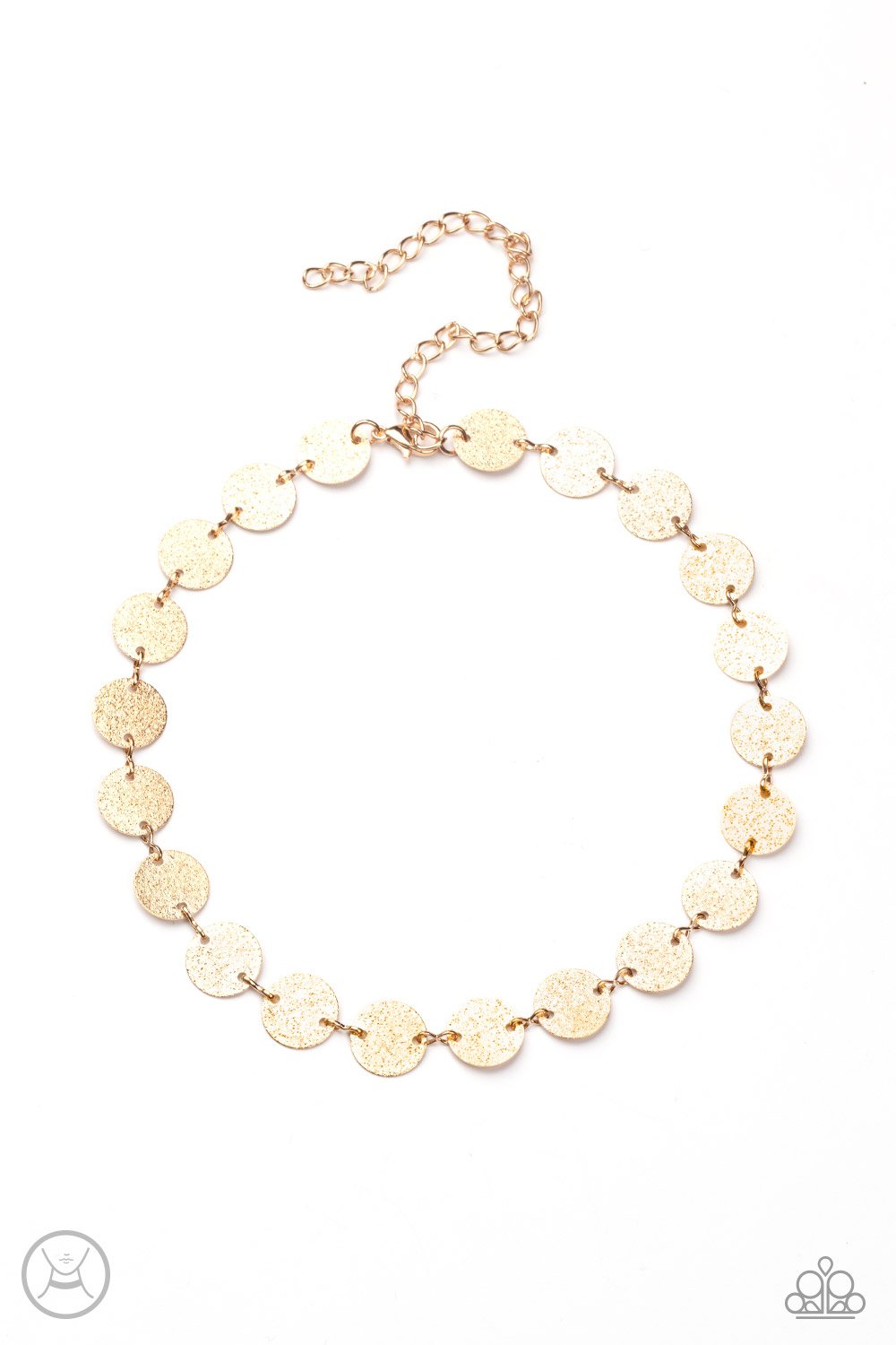 Hammered in shimmery detail, a shiny collection of dainty gold discs delicately link into a blinding display around the neck. Features an adjustable clasp closure.