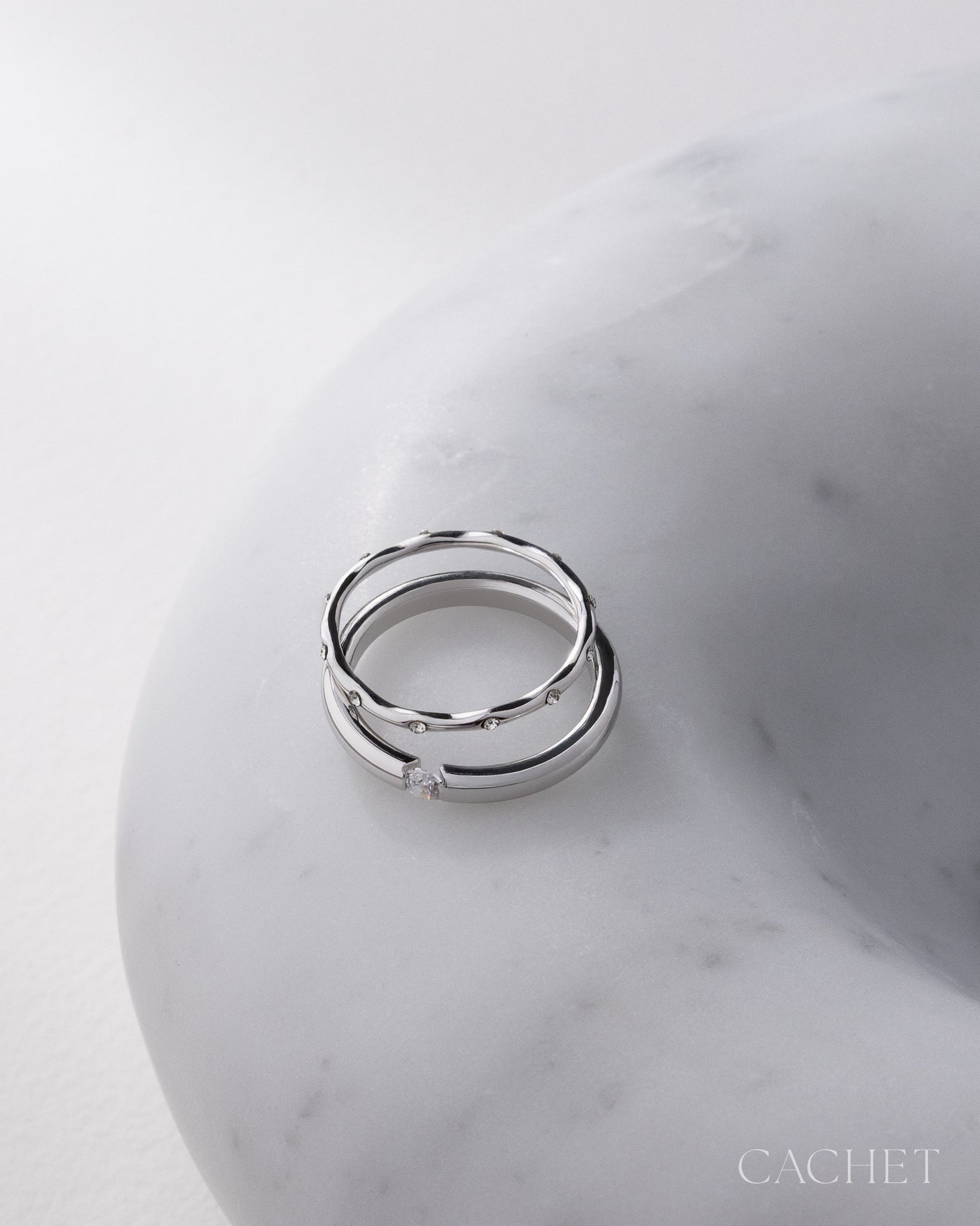 Like a dream woven in contrast, Rêve pairs a slender, textured band dusted with rhinestone shimmer with a bolder silver counterpart, where a solo cubic zirconia accentuates that shimmer with eye-catching light and quiet allure.