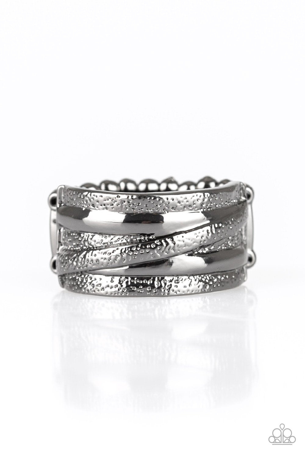 Delicately hammered in shimmery textures, glistening gunmetal bands wrap around the finger for a refined look. Features a stretchy band for a flexible fit.
