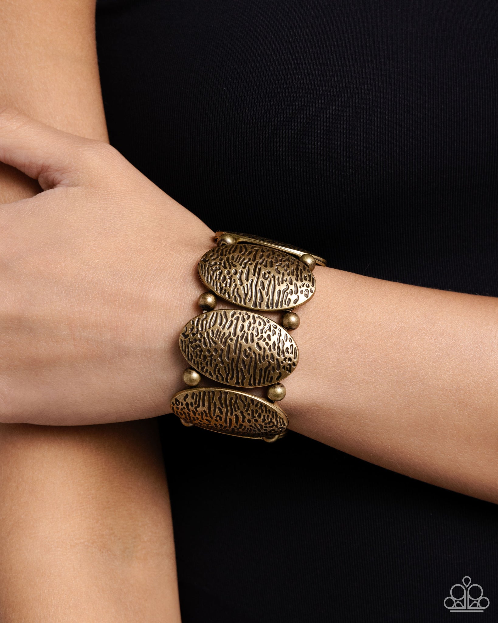 Inspired by rippling waters, an abstract pattern is stamped across oversized brass oval frames. Separated by dainty brass beads, the rustic frames are threaded along stretchy bands around the wrist for an artisan inspired fashion.