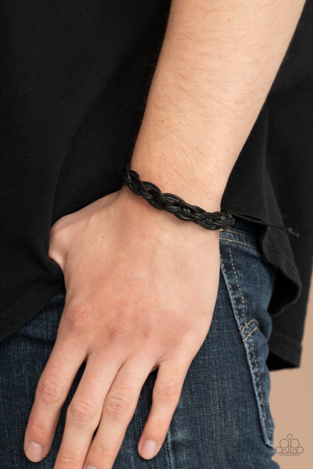 Knotted strands of black cording and black leather laces weave across the wrist, creating a rugged braid. Features an adjustable sliding knot closure.