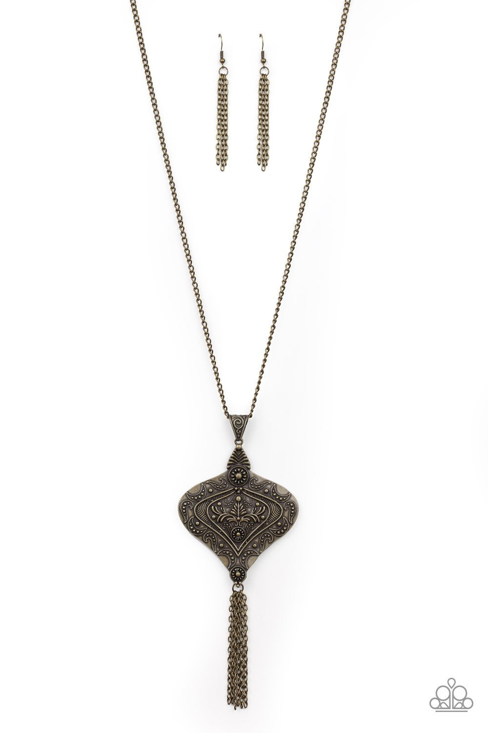 Embossed and studded in ornate details, an oversized brass pendant swings from the bottom of a lengthened brass chain for a rustic look. Antiqued brass chains stream from the bottom of the decorative frame, adding dramatic length to the seasonal piece. Features an adjustable clasp closure.